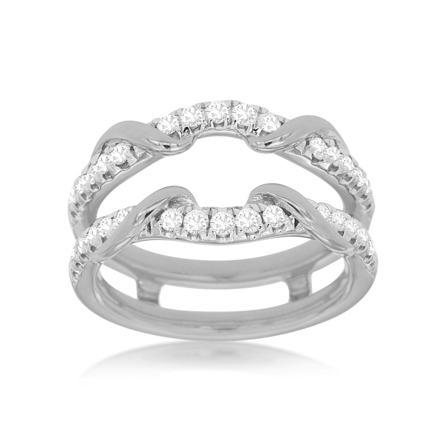 This 14K white gold ring guard is set with round brilliant cut diamonds in a flowing design that frames and enhances your center ring. Its polished finish and sparkling accents make it a beautiful complement to an engagement ring or band.Details