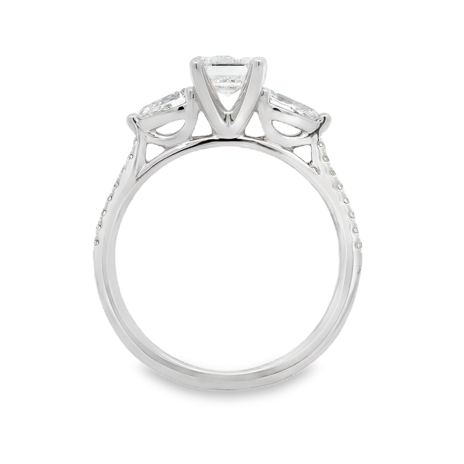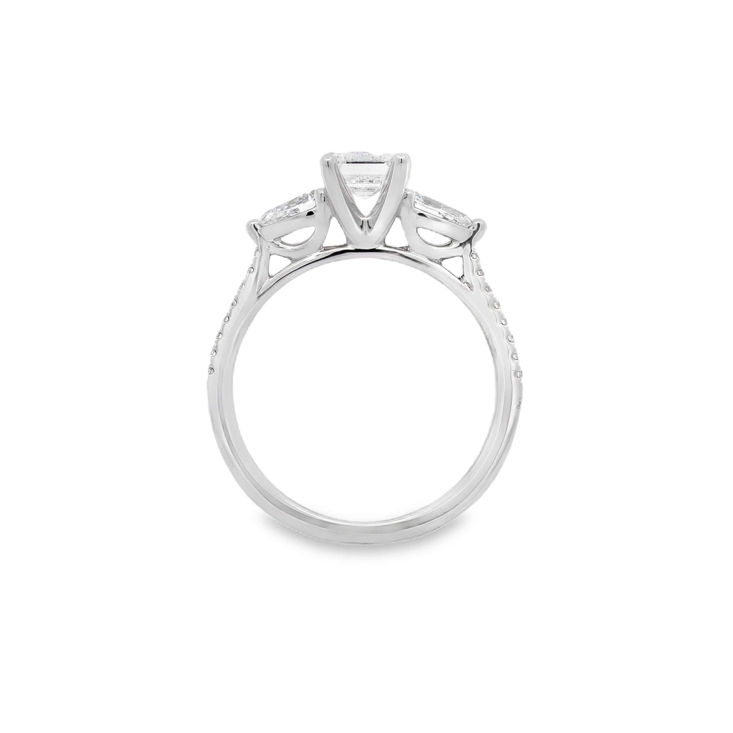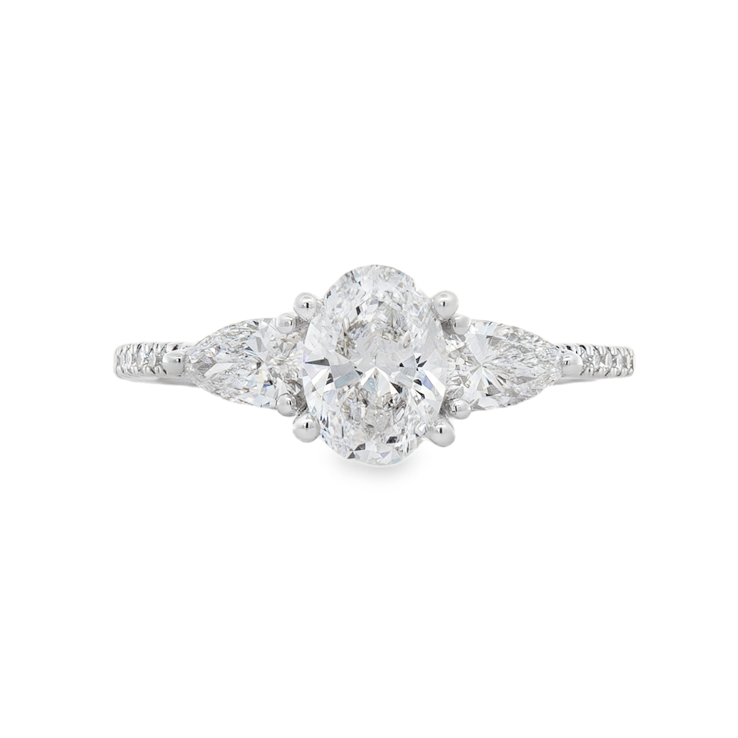 This 14K white gold engagement ring showcases an oval lab grown diamond, accented by two pear shaped lab grown diamonds for a striking three-stone arrangement. The band is delicately accented with round brilliant cut lab grown diamonds, adding refinement to the design. This ring is a graceful and thoughtful choice to mark a meaningful moment.Details