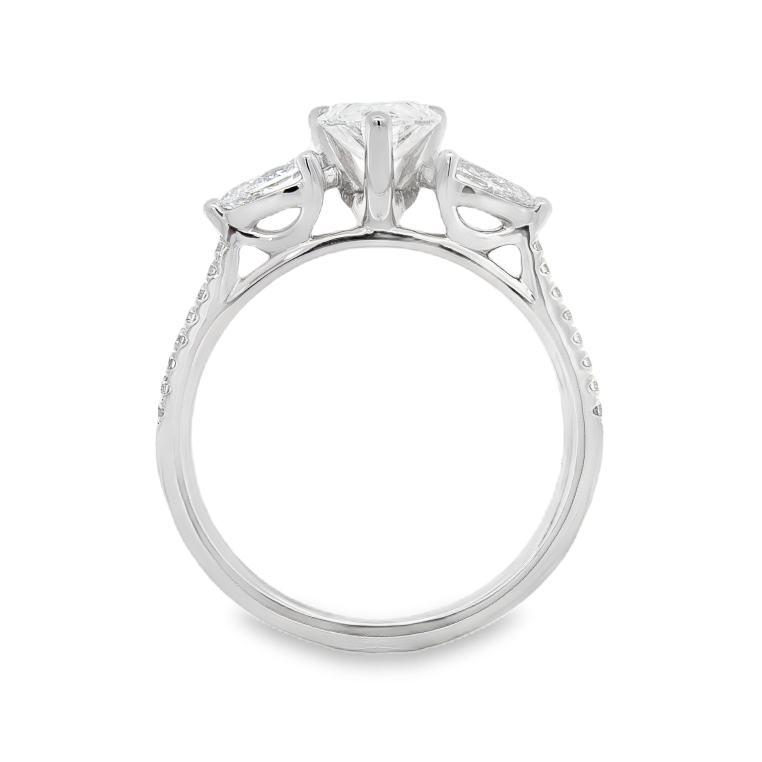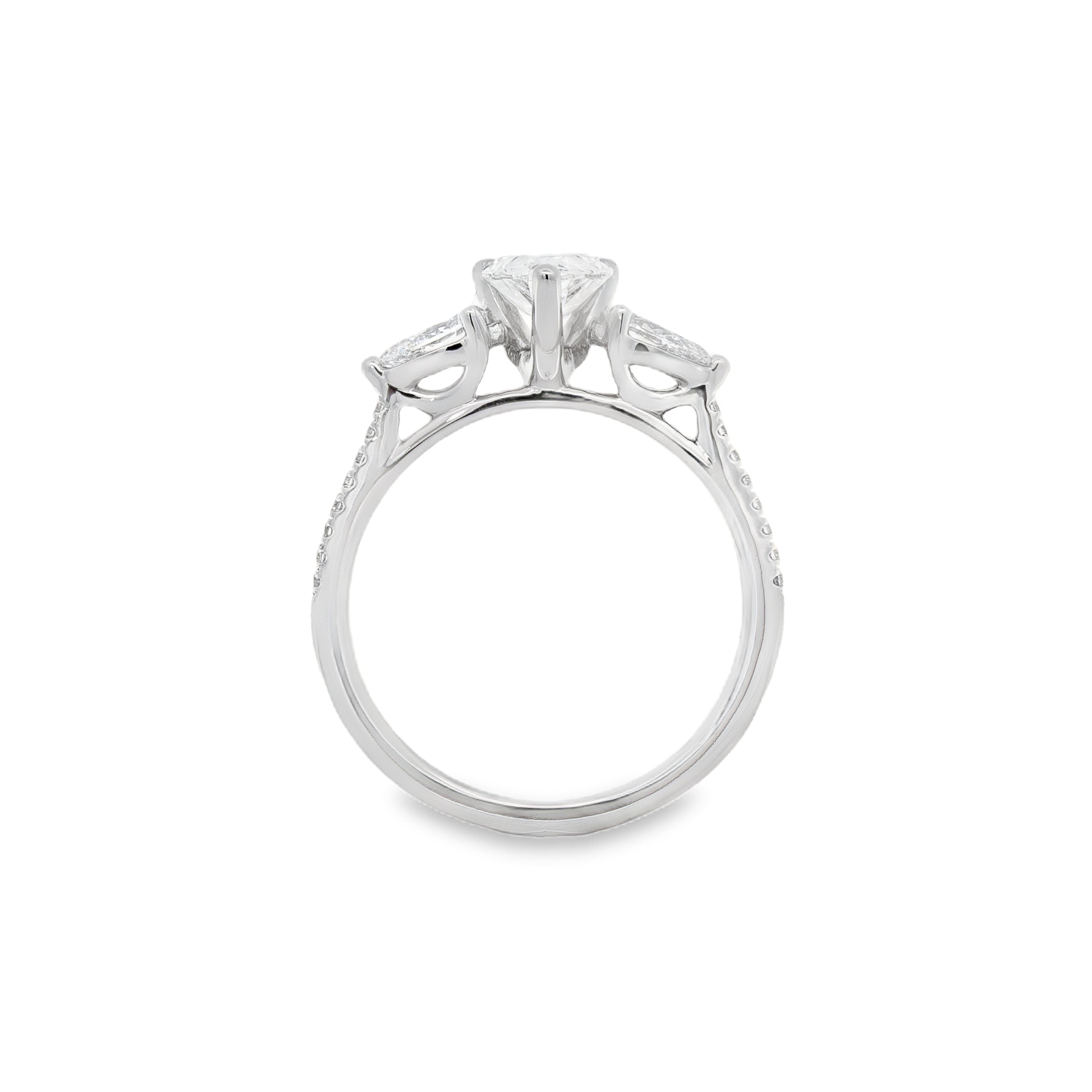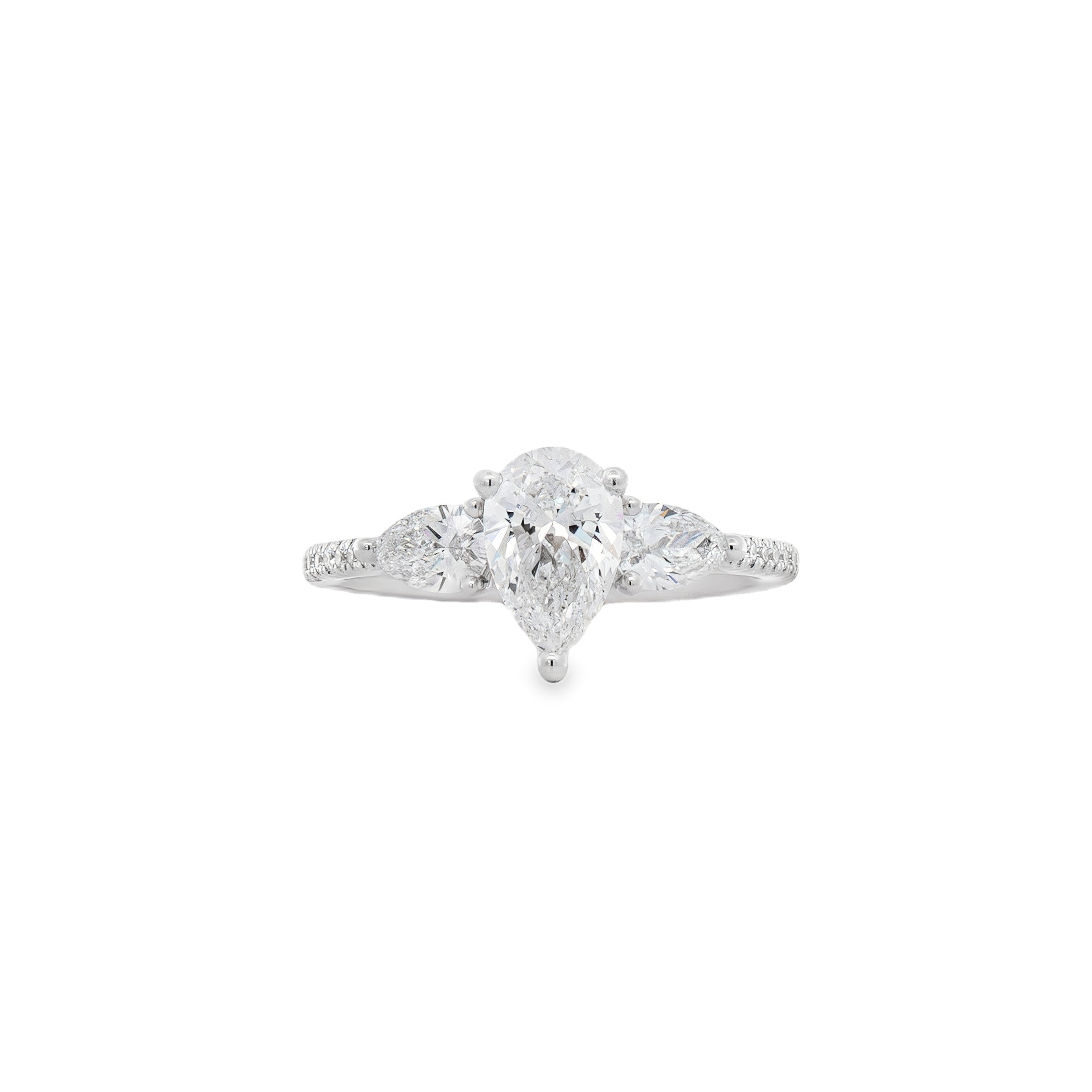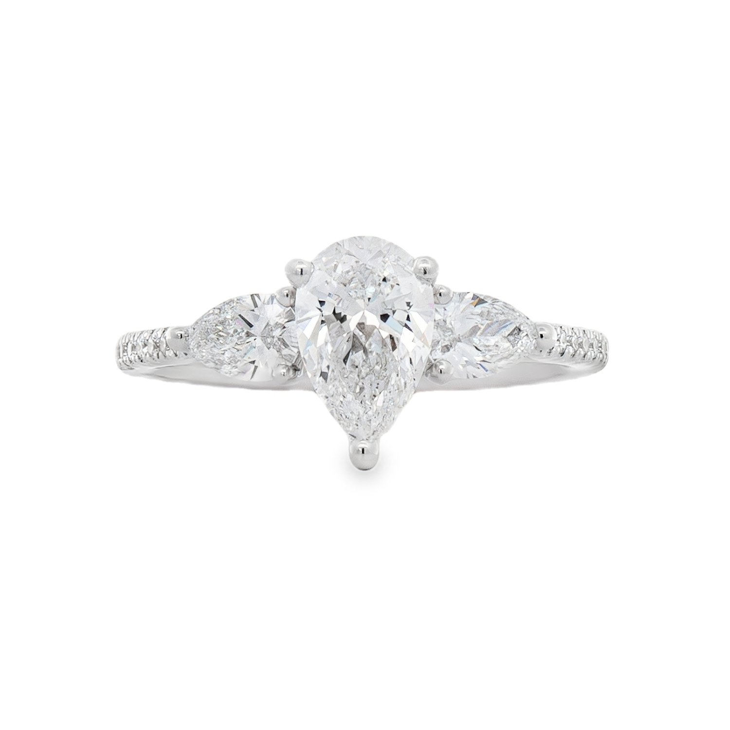 This 14K white gold engagement ring features a striking pear-shaped lab grown diamond, accented by two side stones for added brilliance. With its elegant silhouette and refined sparkle, it's a timeless choice for marking life’s most meaningful moments.Details