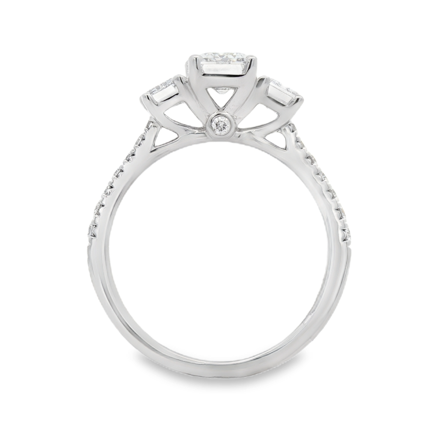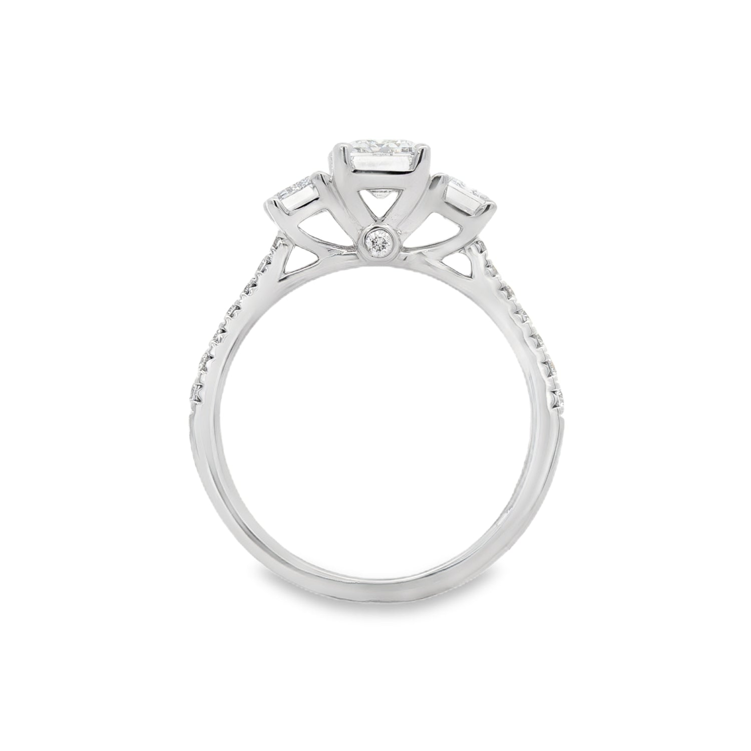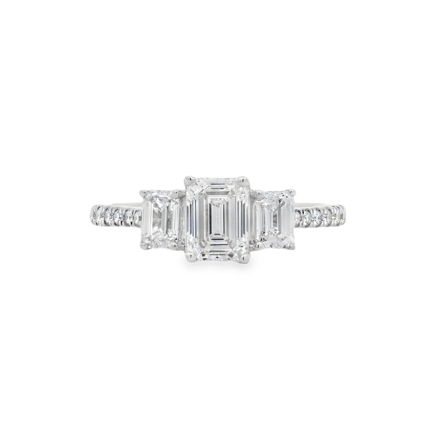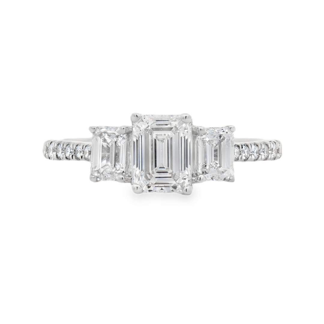 This 14K white gold engagement ring features a striking emerald cut lab grown diamond at the center, flanked by two smaller emerald cut lab grown diamonds on each side, creating a sleek and balanced silhouette. The ring is lined with round lab grown diamonds that add a soft shimmer to its geometric design. This piece offers a clean, modern aesthetic with timeless sophistication.Details