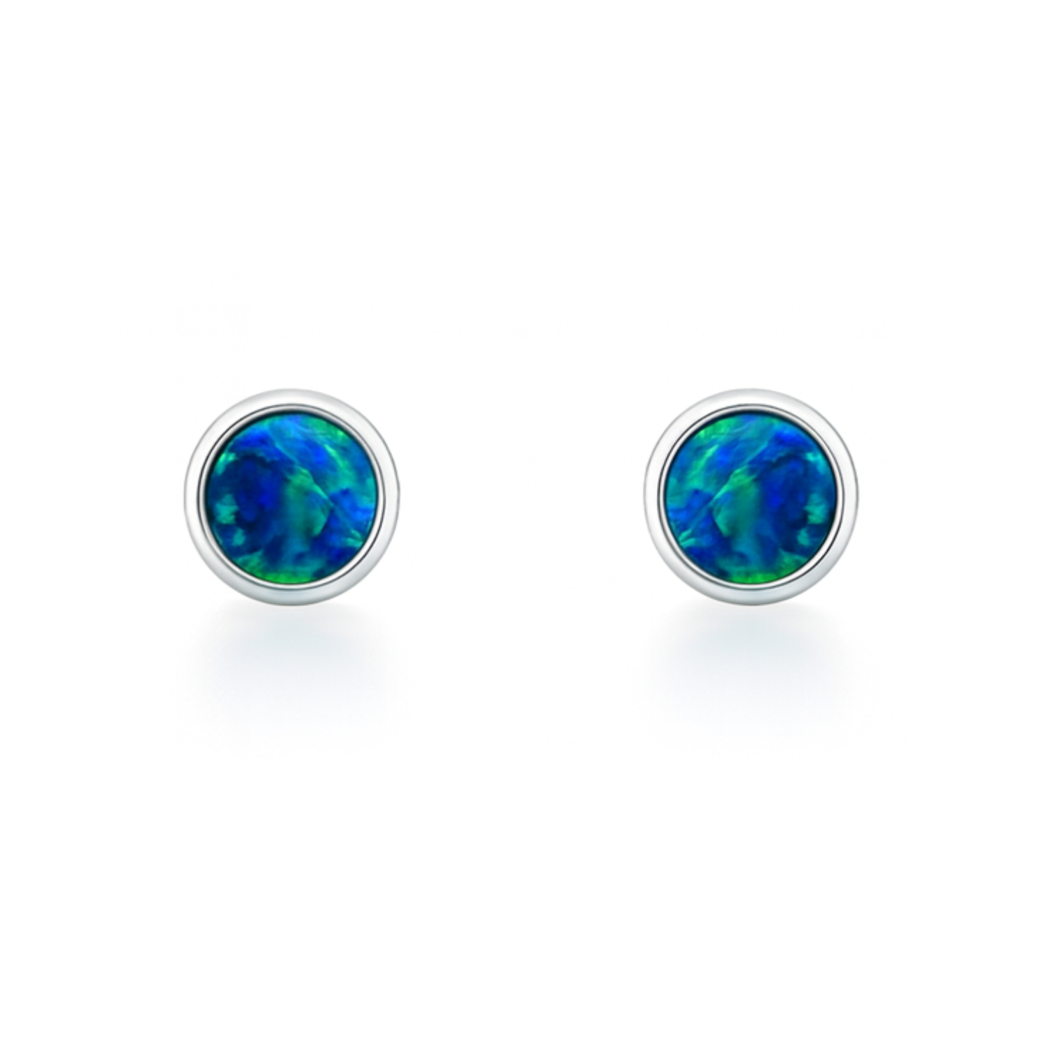 14 karat white gold stud earrings bezel set with two 5 mm round opal doublets, equipped with friction style backs.Details
