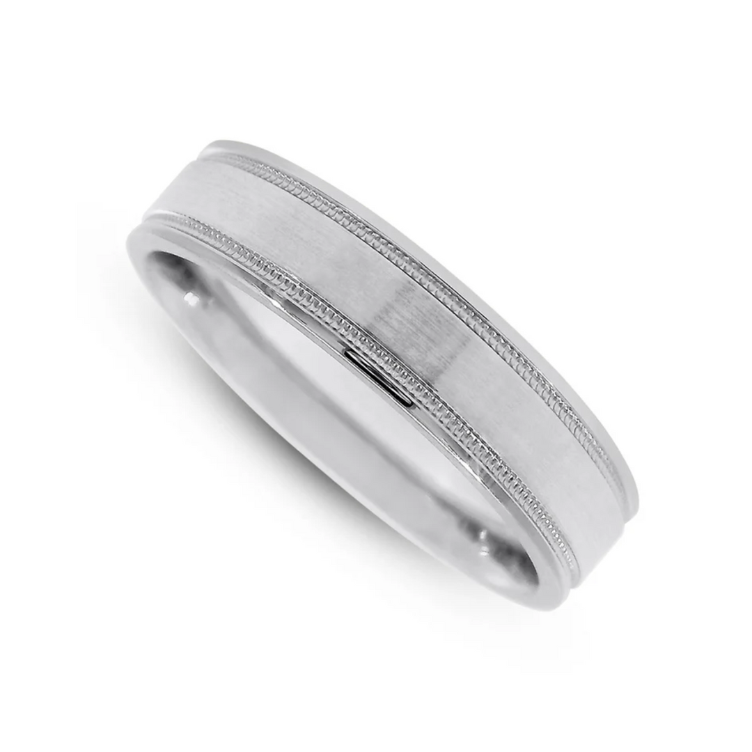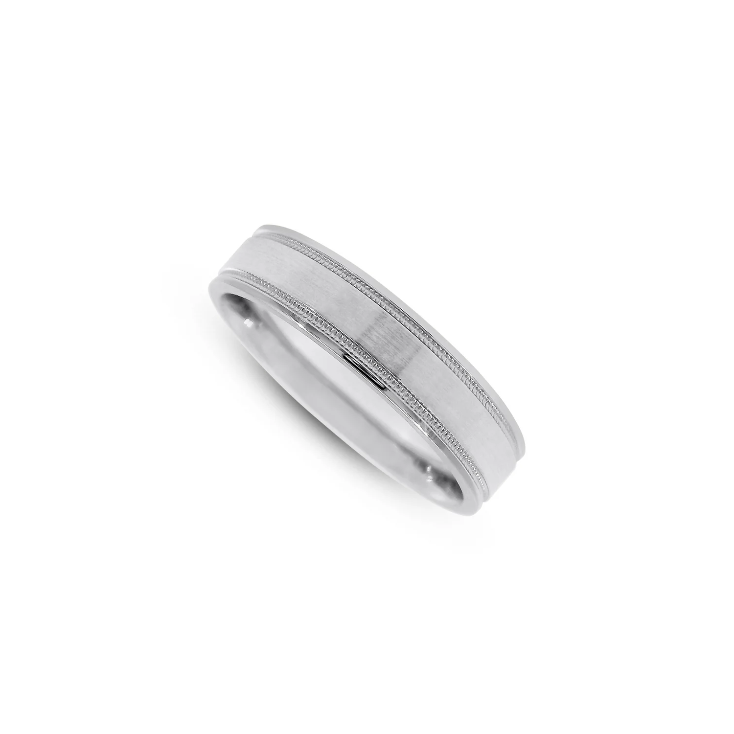 14 karat white gold 6 mm carved comfort fit wedding band with satin finish center, milgrain, and a polished flat edge.Details