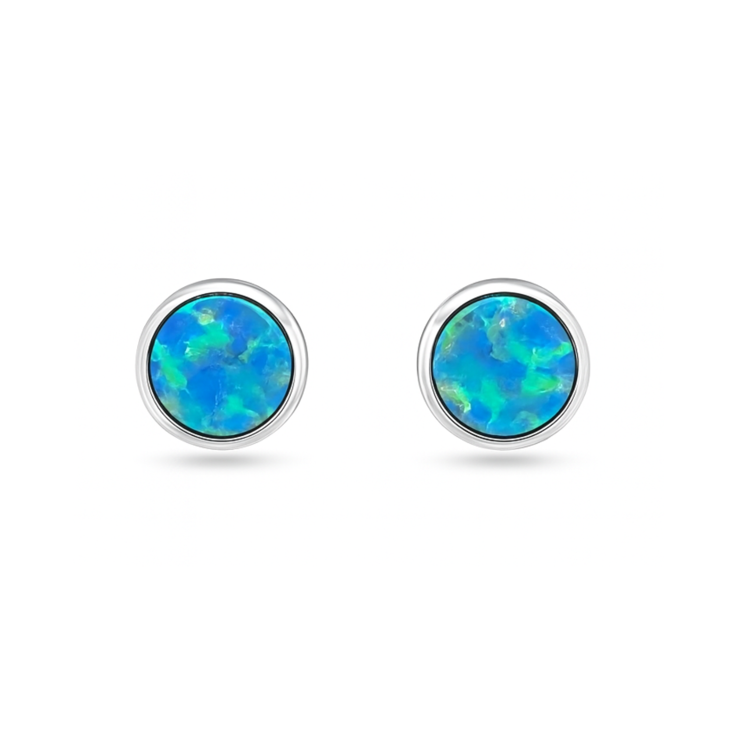14 karat white gold stud earrings bezel set with two 6 mm round opal doublets, equipped with friction style backs.Details
