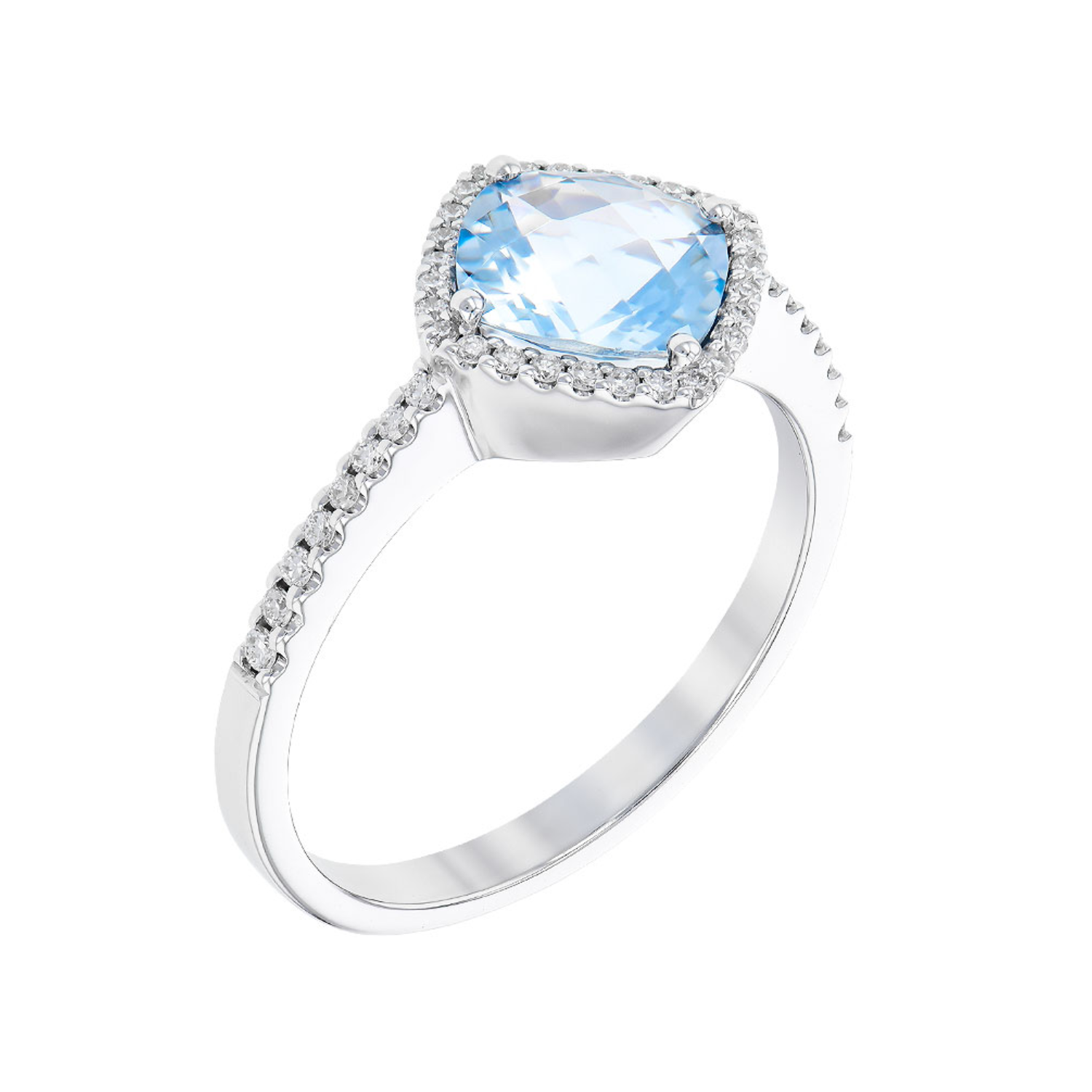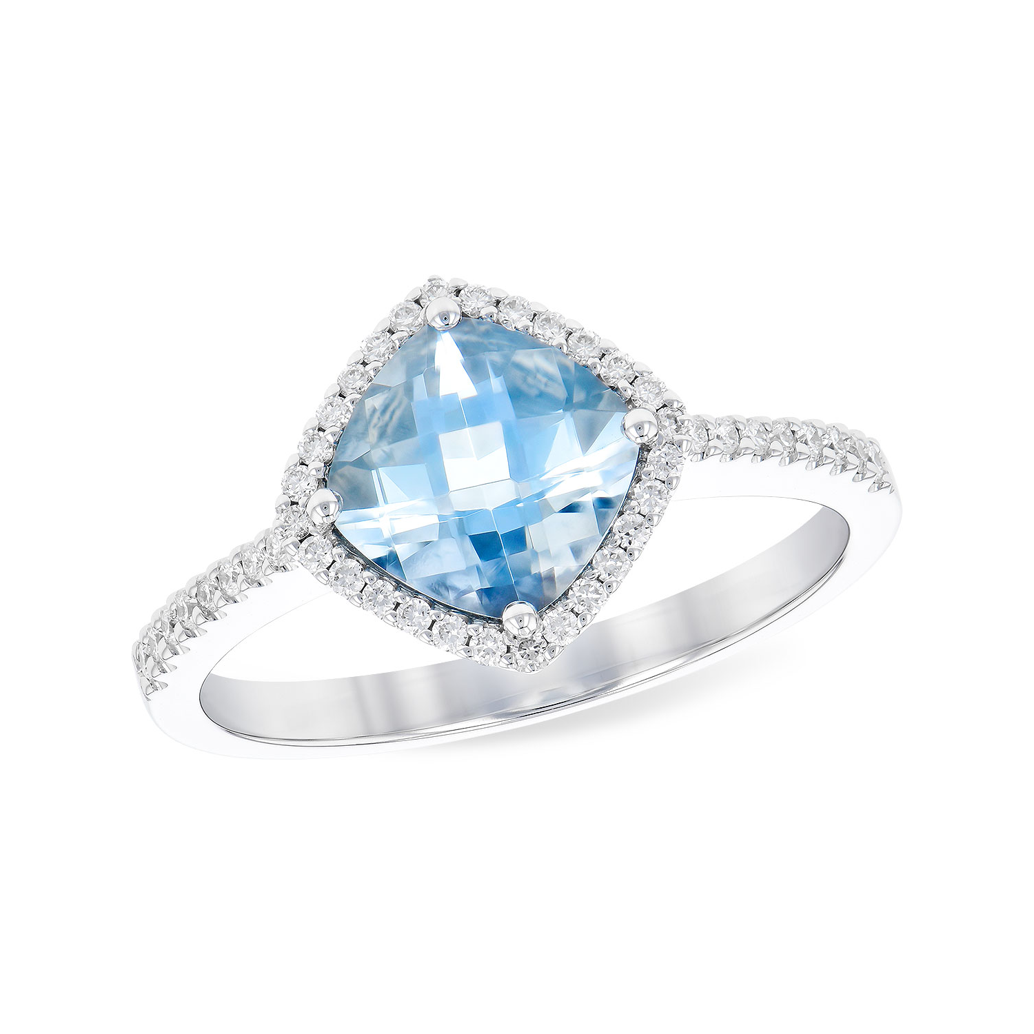 14 karat white gold halo style ring set with one 1.13 carat cushion checkerboard cut aquamarine, accented with 44 round brilliant cut diamonds at 0.16 carat total weight with G color and SI1 clarity.Details