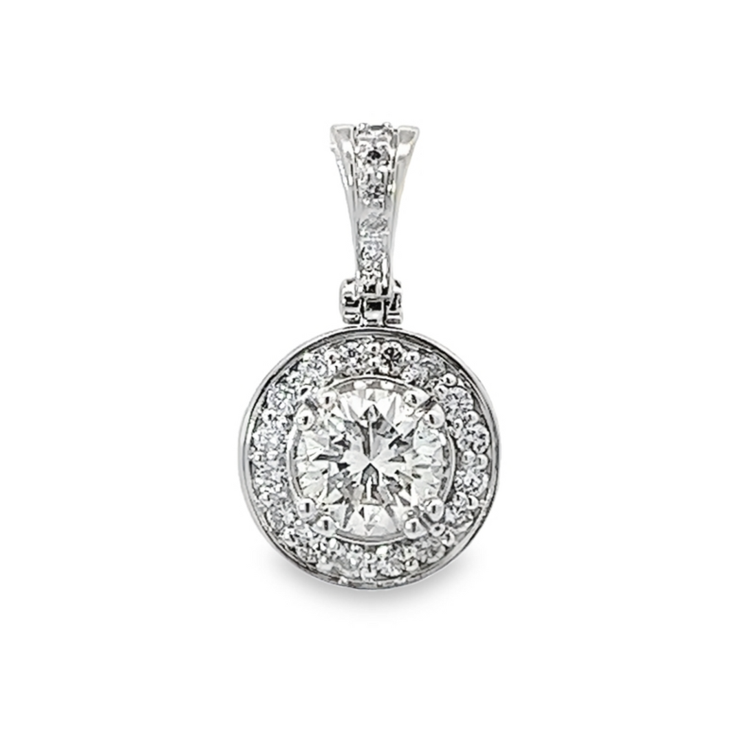 Elevate your elegance with our 14K white gold Bensel Made diamond halo pendant. This exquisite piece features a stunning round brilliant cut diamond, surrounded by a halo of smaller diamonds, all meticulously set in lustrous 14K white gold. The halo design enhances the center diamond's brilliance, creating a dazzling display of sparkle and sophistication. Perfect for special occasions or adding a touch of luxury to your everyday look, this diamond halo pendant is a timeless addition to any jewelry collection. Embrace the refined beauty and craftsmanship of this exceptional piece.Details