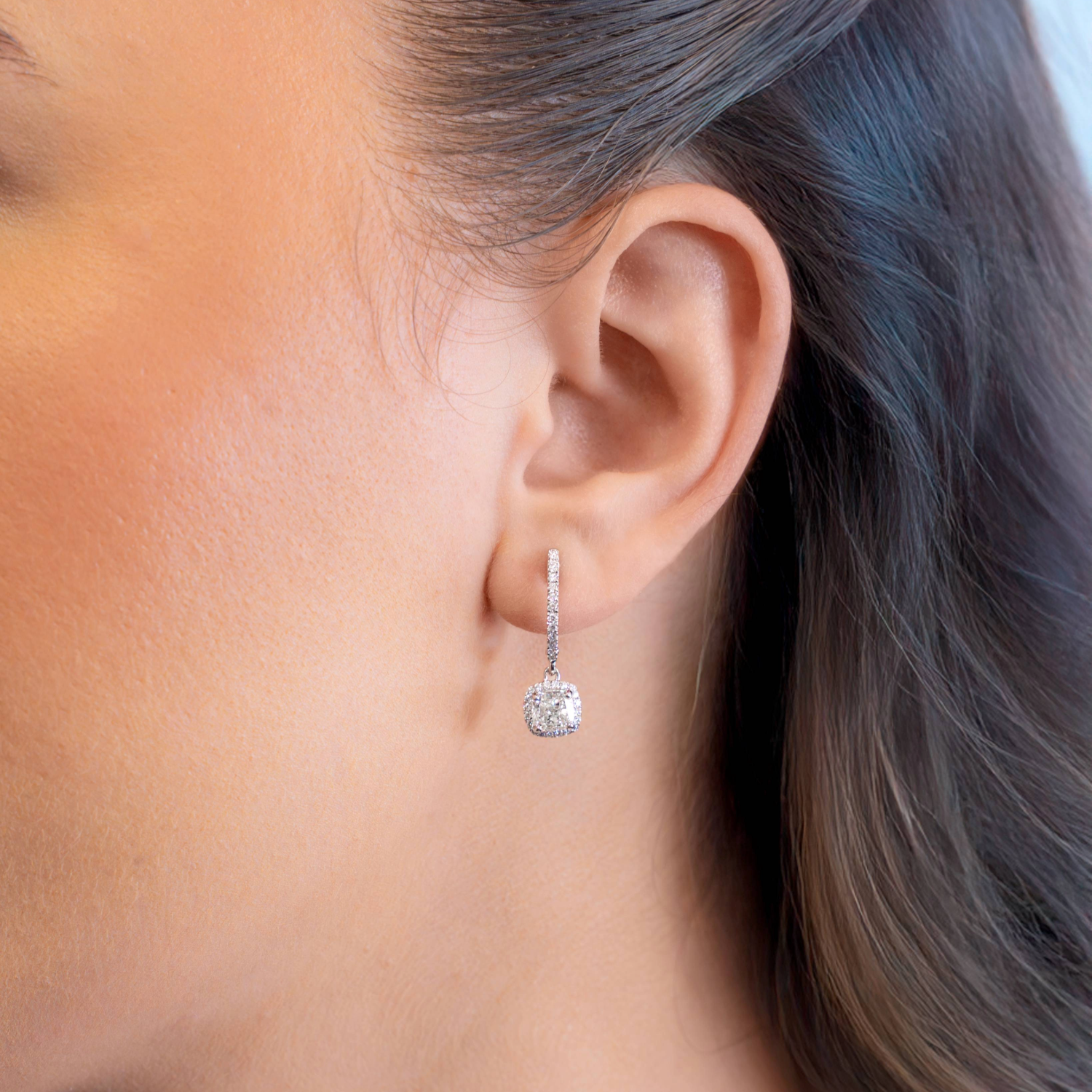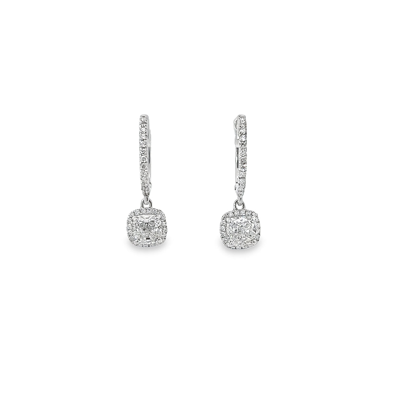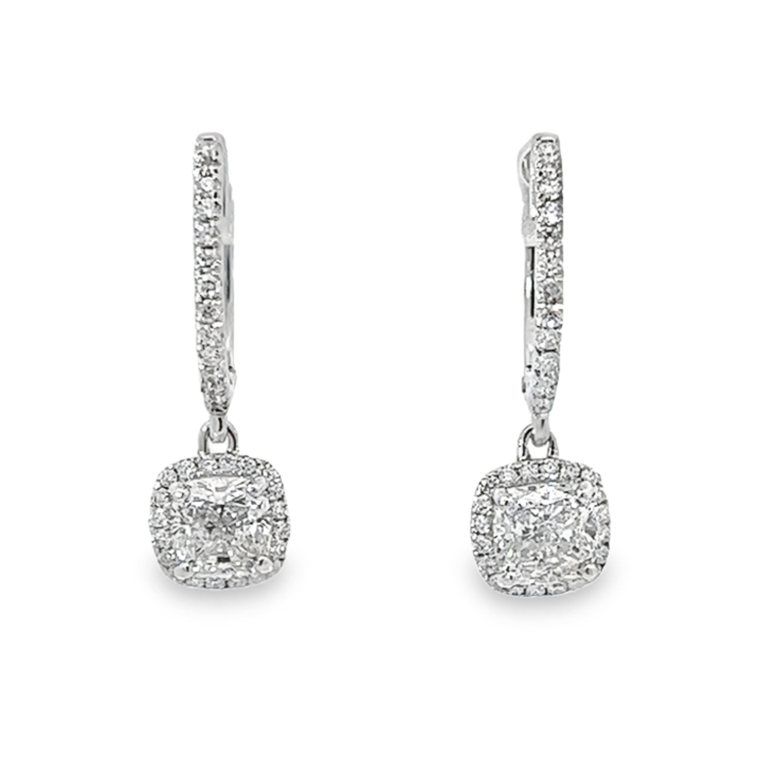 Elevate your elegance with our 14K white gold diamond earrings. These stunning earrings feature dazzling cushion cut diamonds, each surrounded by a halo of smaller diamonds, enhancing their brilliance and sparkle. The diamonds are expertly set in sleek 14K white gold, adding a touch of sophistication to any outfit. Perfect for special occasions or adding a hint of glamour to your everyday look, these diamond earrings are a timeless addition to any jewelry collection.Details
