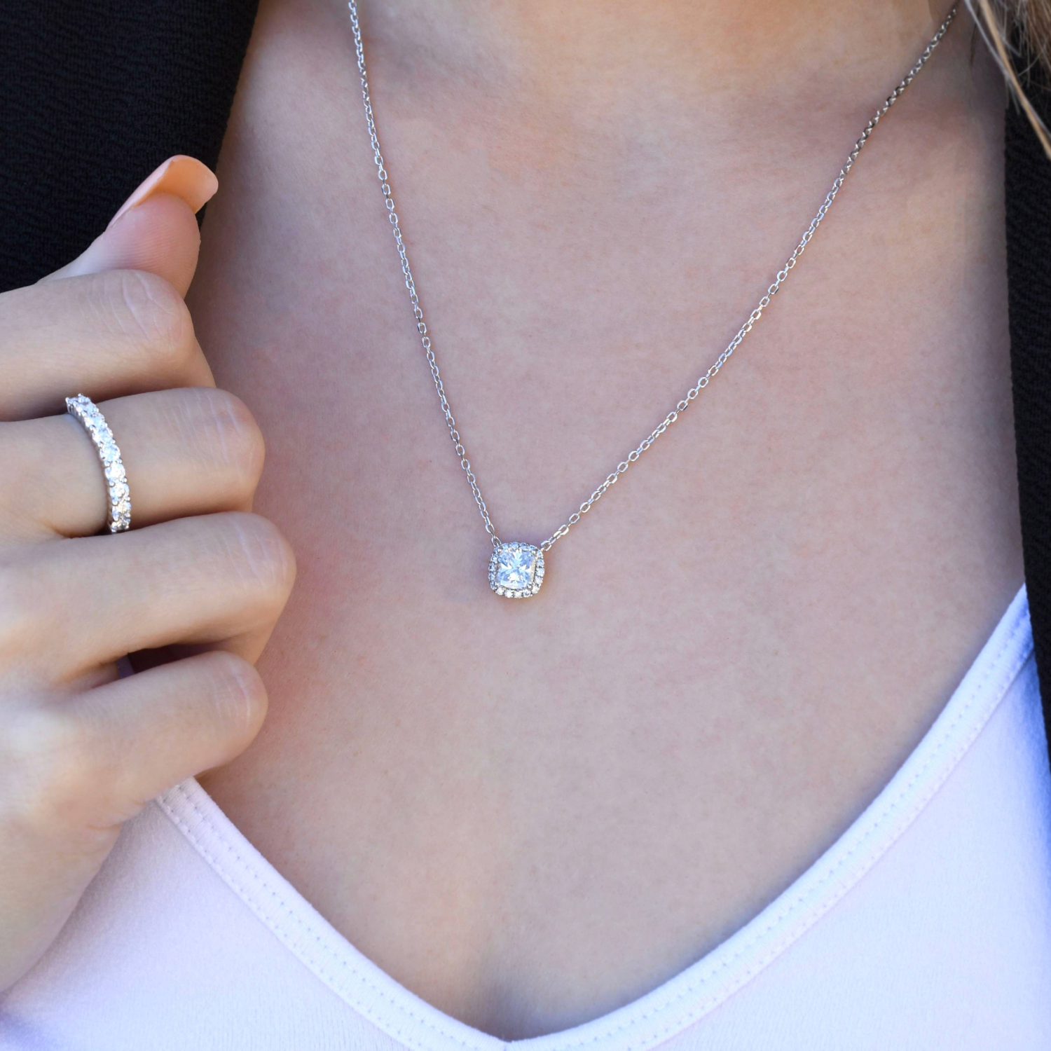 Introducing the Bensel Made 14K white gold diamond cushion cut halo necklace - a masterpiece of elegance and craftsmanship. At the heart of this exquisite necklace lies a mesmerizing cushion cut diamond, celebrated for its soft, rounded corners and brilliant facets. Surrounding this central gem is a halo of meticulously set diamonds, enhancing its radiant sparkle. Suspended gracefully from a delicate 14K white gold chain, this necklace is not just a piece of jewelry, but a testament to the Bensel Made commitment to excellence and design.Details