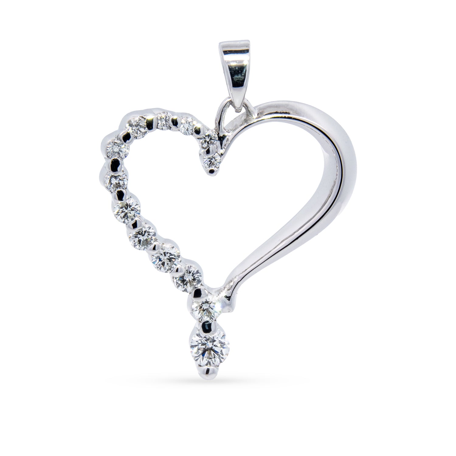 14 karat white gold Bensel Made estate tapering heart pendant set with 13 round brilliant cut diamonds at 0.75 carat total weight with H - I - J color and SI1 - I1 clarity.Details