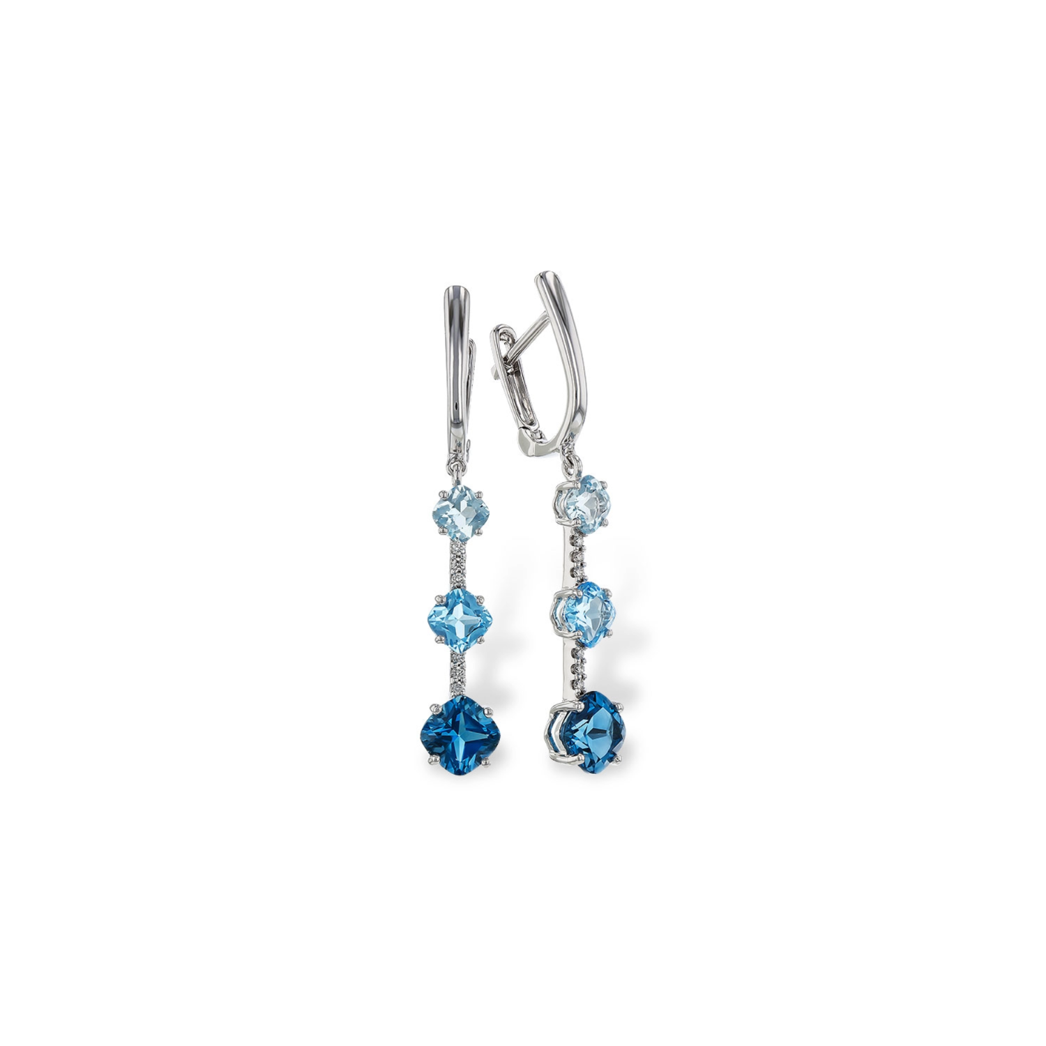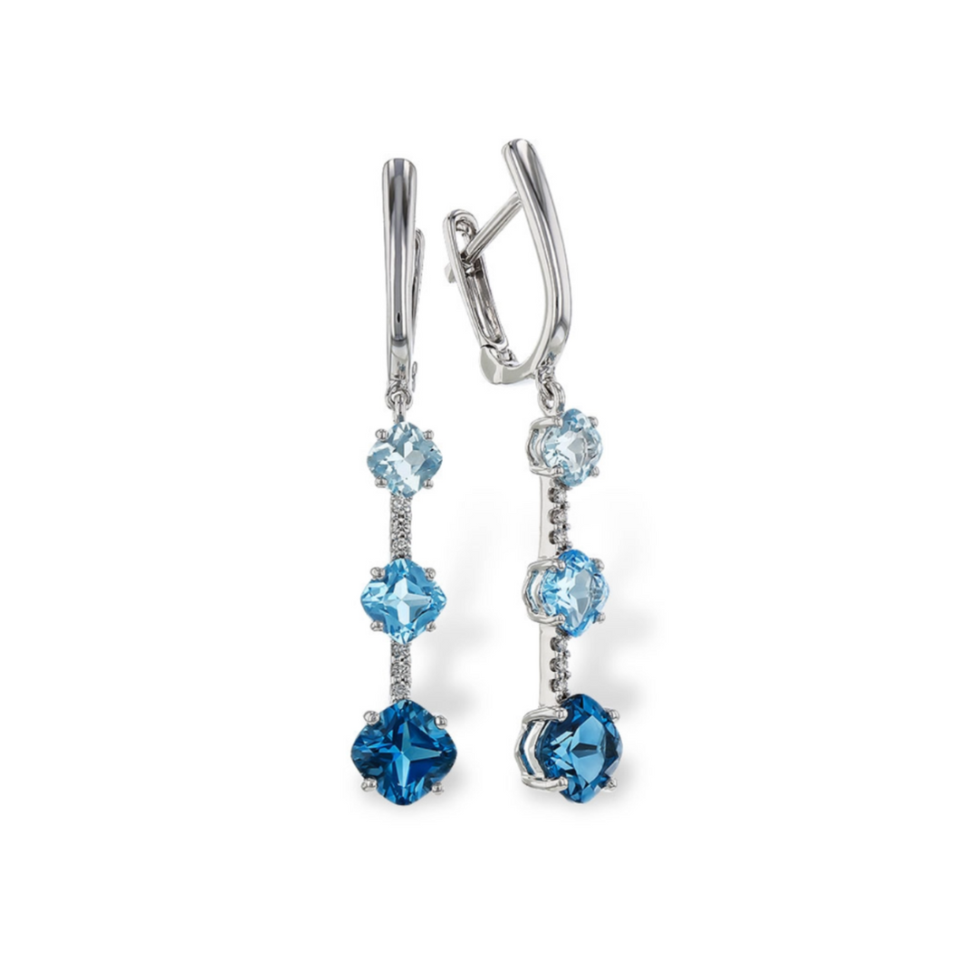These 14K white gold dangle earrings showcase a graceful cascade of blue topaz in varying shades, accented by delicate diamond details. The graduated hues add depth and dimension, while the elongated silhouette brings elegant movement. Perfect for evening wear or special occasions, these earrings offer a refined touch of color and sparkle.Details