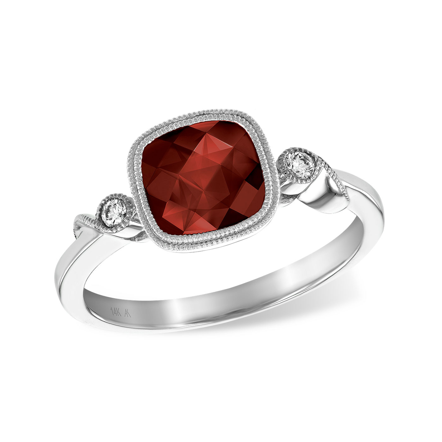 14 karat white gold three stone style ring bezel set with one 1.79 carat cushion checkerboard cut garnet, accented with two bezel set round brilliant cut diamonds at 0.05 carat total weight with G color and SI1 clarity.Details
