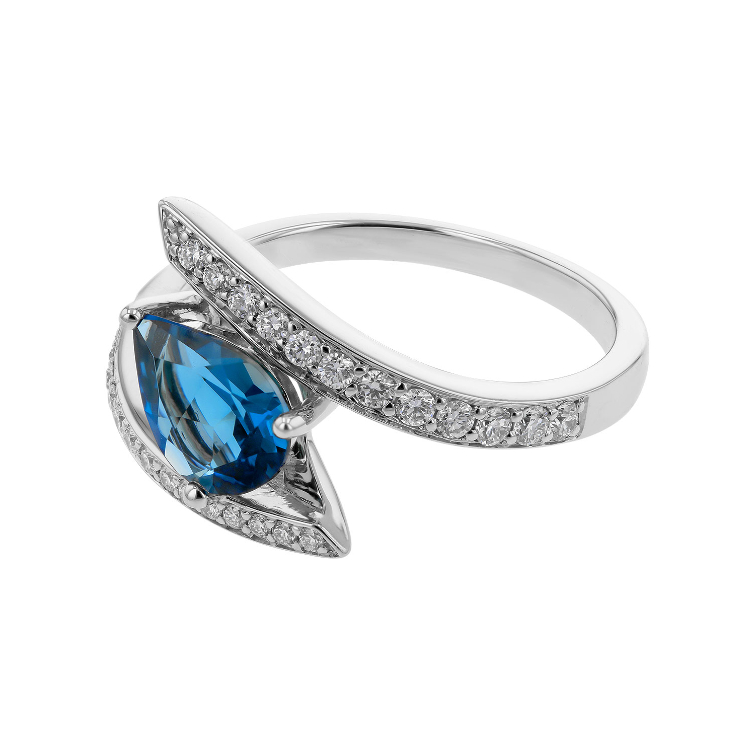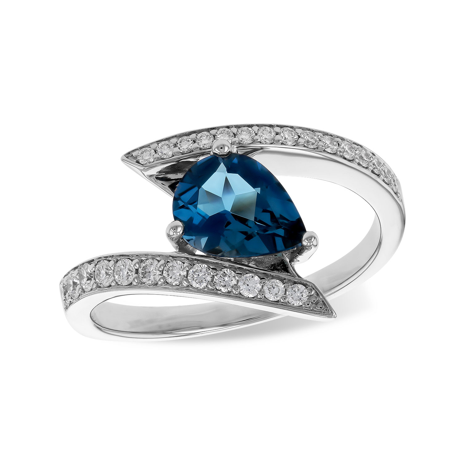 This ring is crafted in 14K white gold and features a striking pear-shaped London blue topaz at its center. The bypass-style design is accented with round brilliant cut diamonds along both arms, creating a fluid and elegant silhouette.Details