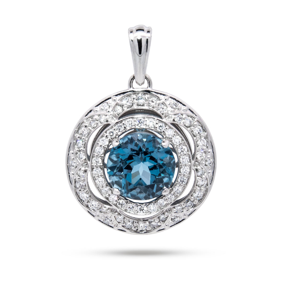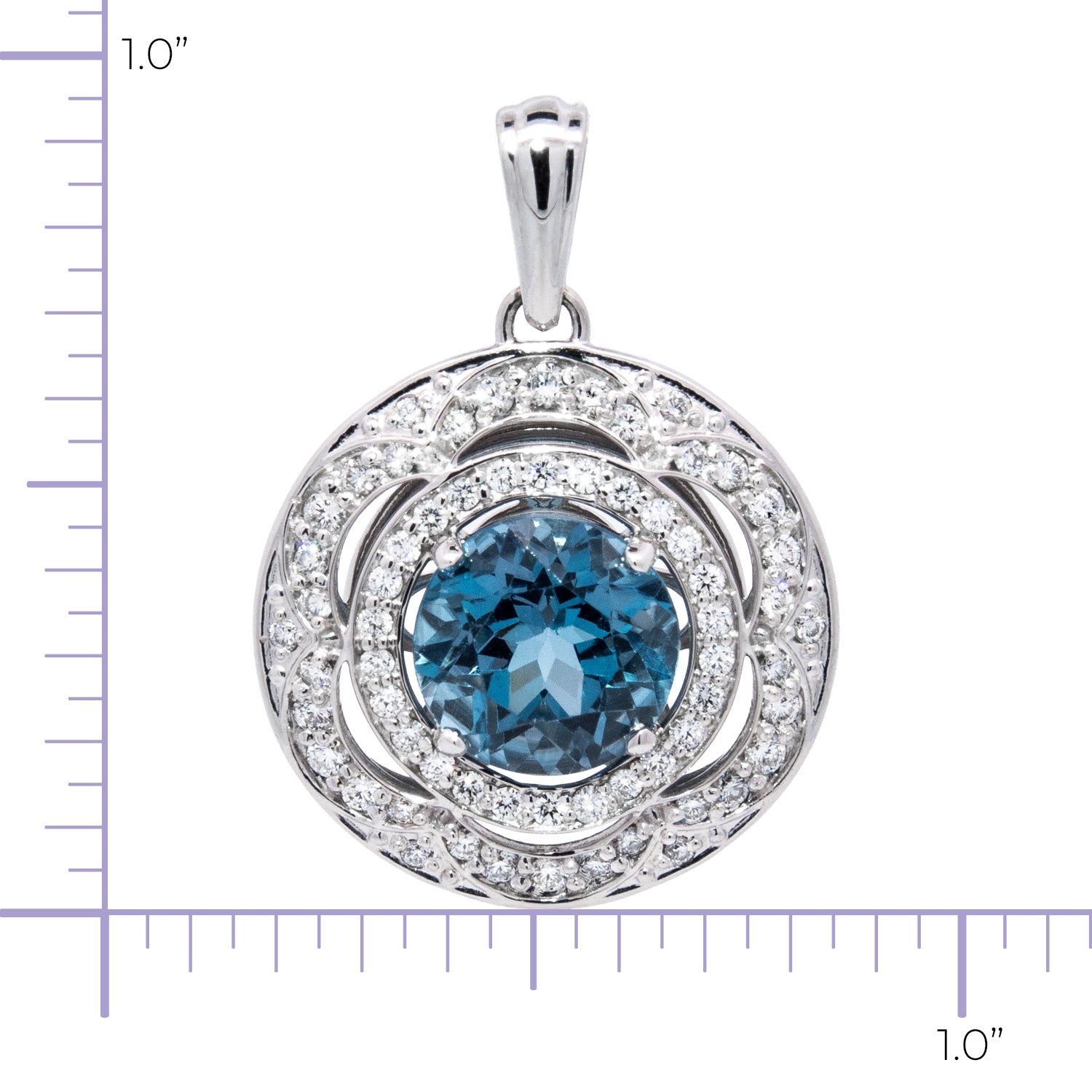 14 karat white gold vintage motif pendant set with one 2.50 carat round London blue topaz, accented with 62 round brilliant cut diamonds at 0.38 carat total weight.Details