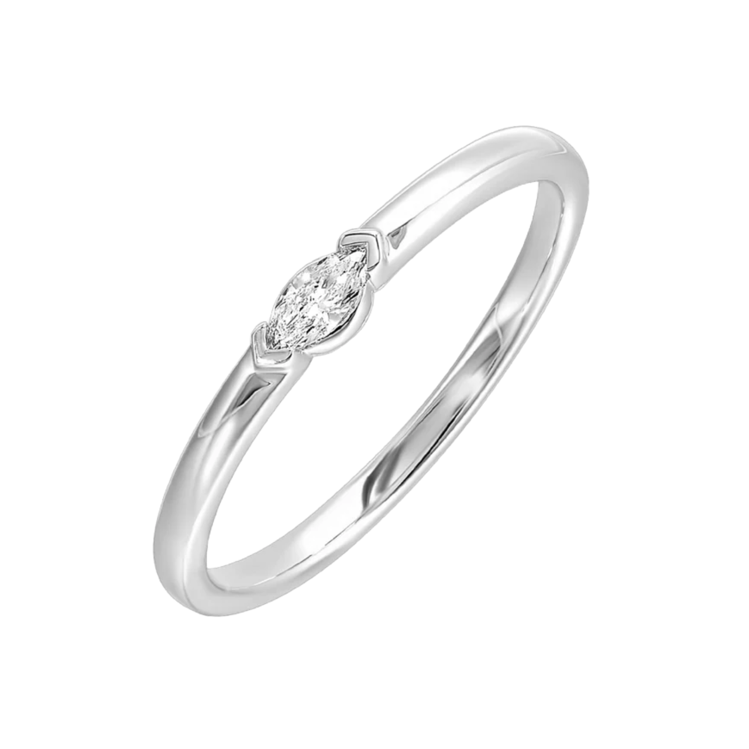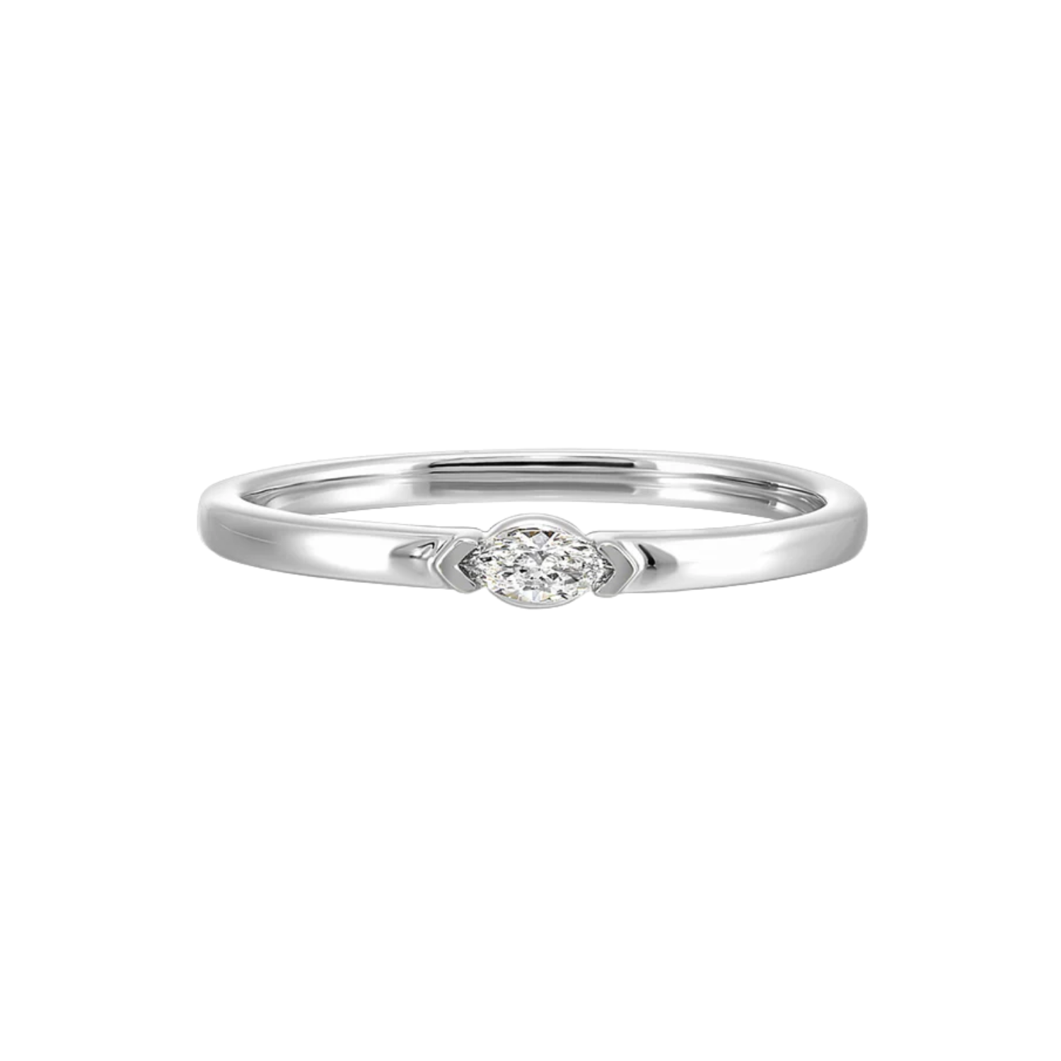 This 14K white gold stackable band features a sleek marquise cut diamond set horizontally at the center, offering a refined twist on a classic silhouette. The minimalist band enhances the elongated brilliance of the marquise diamond, making it a standout on its own or a distinctive addition to any ring stack.Details