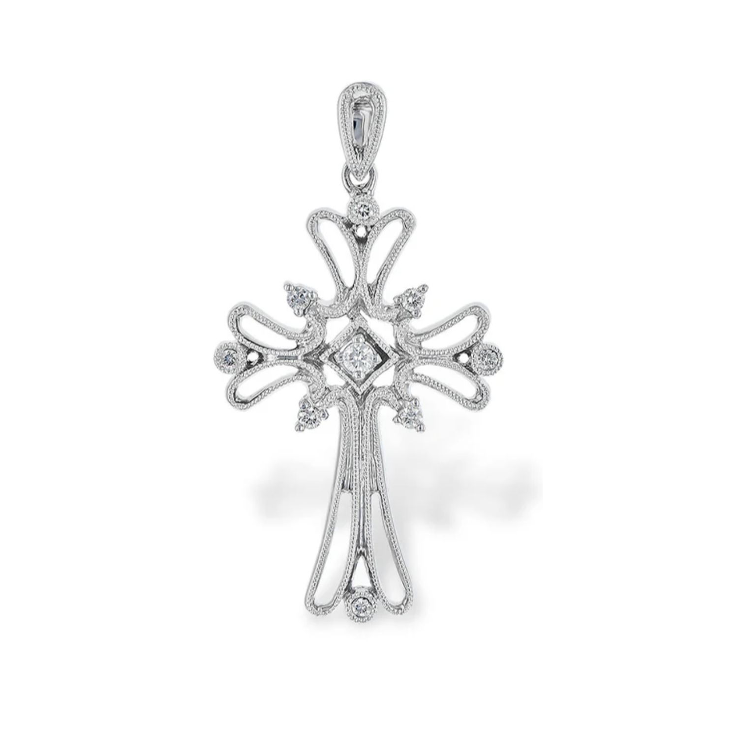 This exquisite 14K white gold necklace showcases a beautifully ornate cross design, embellished with dazzling diamonds. The 14K white gold enhances the brilliance of the diamonds, creating a mesmerizing effect. This sophisticated and deeply symbolic piece of jewelry represents faith and fashion combined, making it an elegant statement piece that complements any outfit. Perfect for special occasions or everyday wear, this diamond cross necklace is a beautiful expression of personal faith and divine beauty.