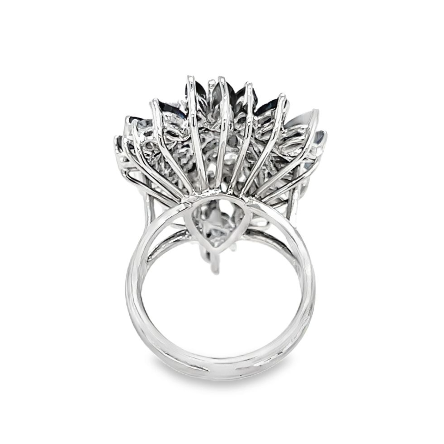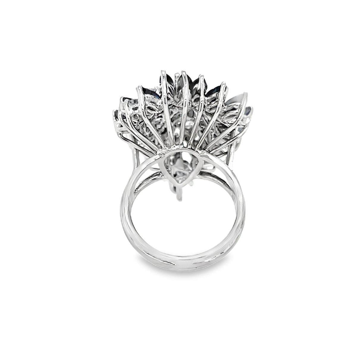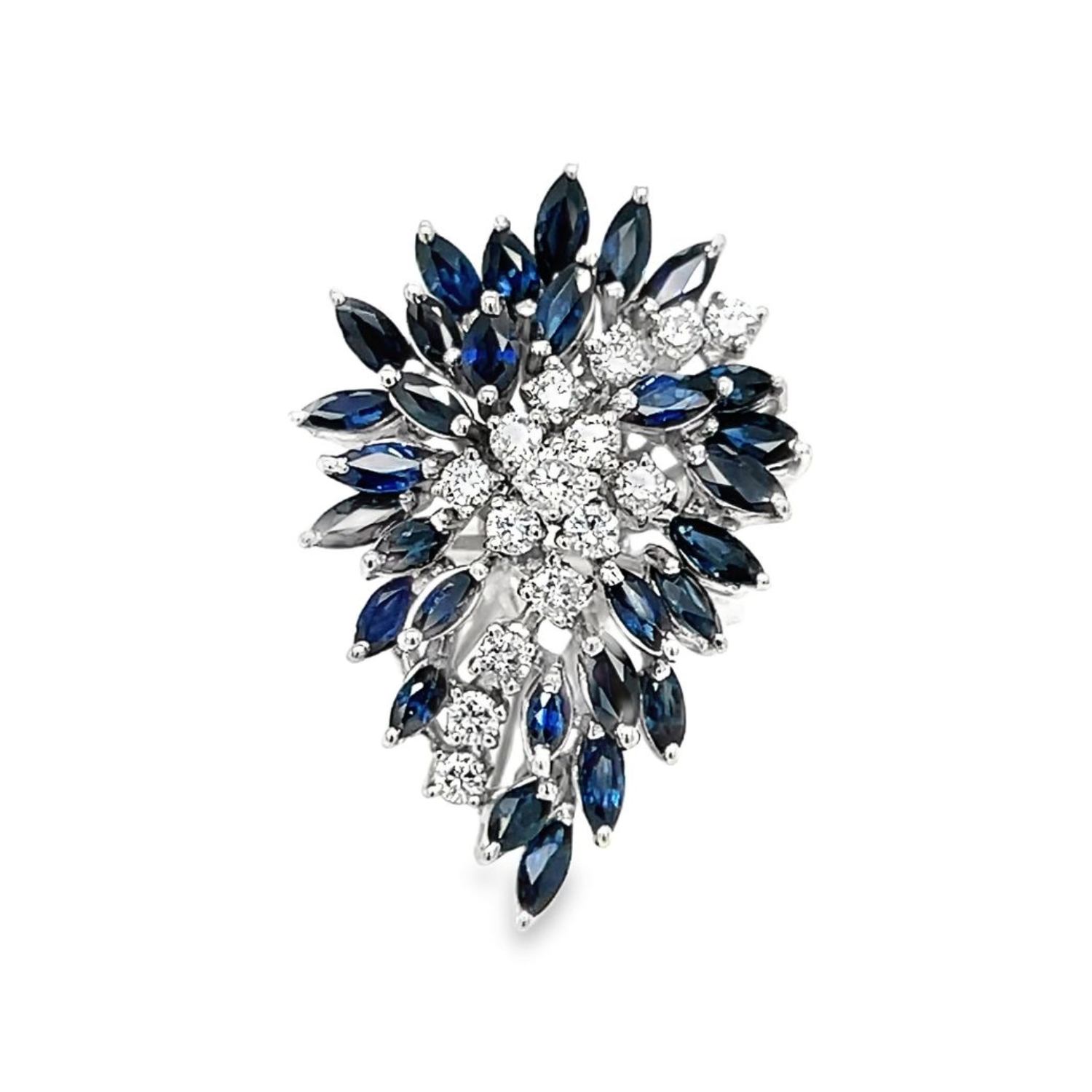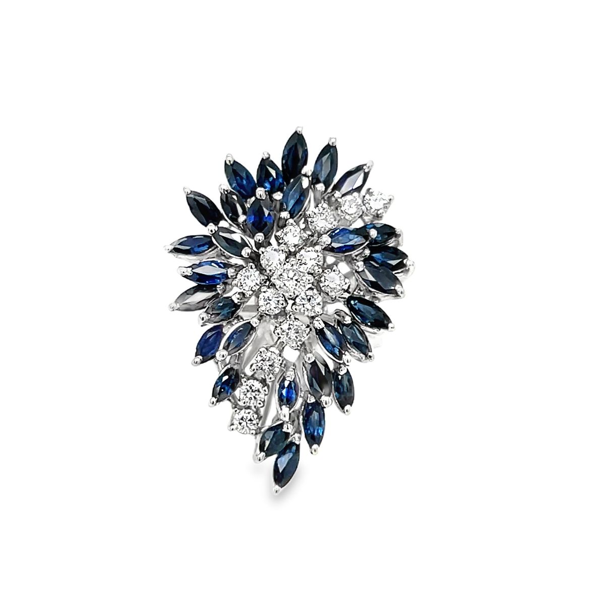 Elevate your collection with this breathtaking 14K white gold estate ring, a masterpiece of artistry and elegance. Featuring a dazzling array of marquise cut sapphires paired with round brilliant cut diamonds, this piece radiates beauty from every angle. Perfect for those who appreciate timeless luxury, this estate ring is an unforgettable statement of sophistication and grace.Details