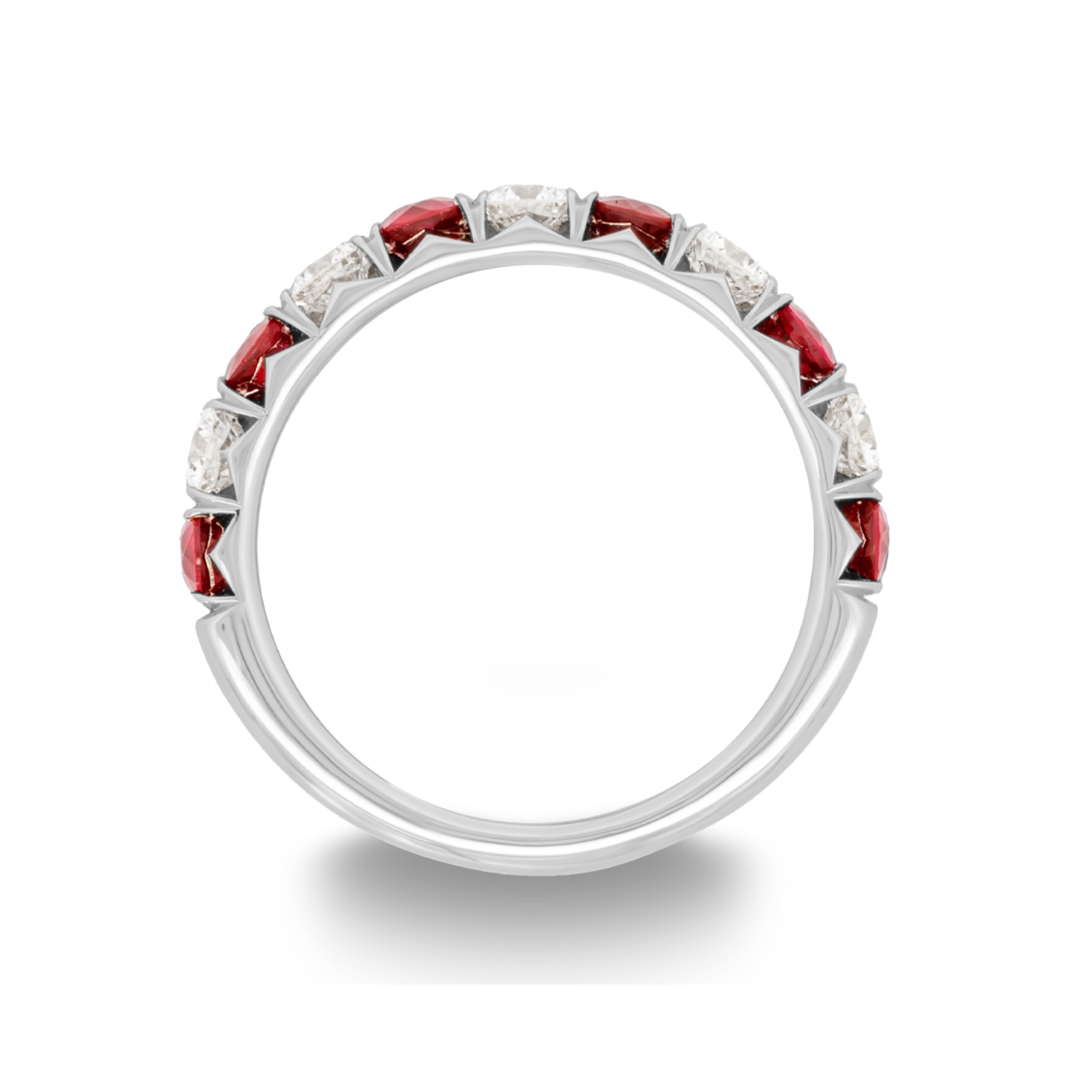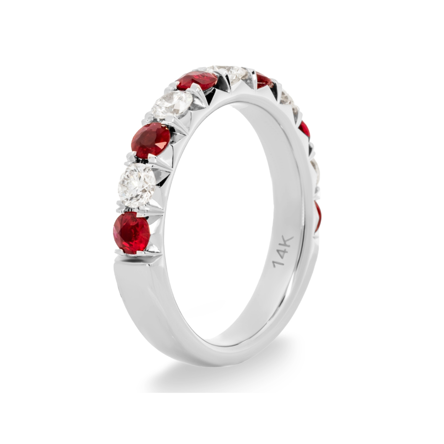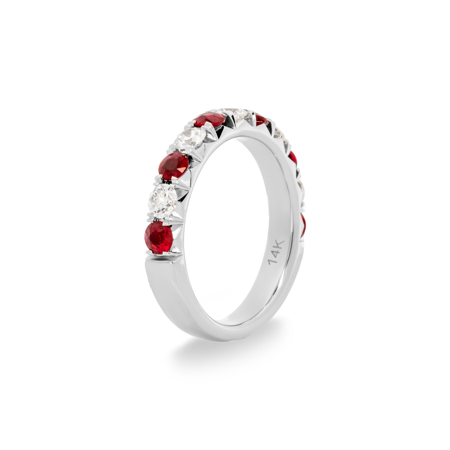 This 14K white gold band features alternating rubies and diamonds. The vivid red of the rubies contrasts beautifully with the sparkle of the diamonds, creating a bold yet refined look. This is a striking piece that pairs effortlessly with other rings or makes a statement on its own.Details