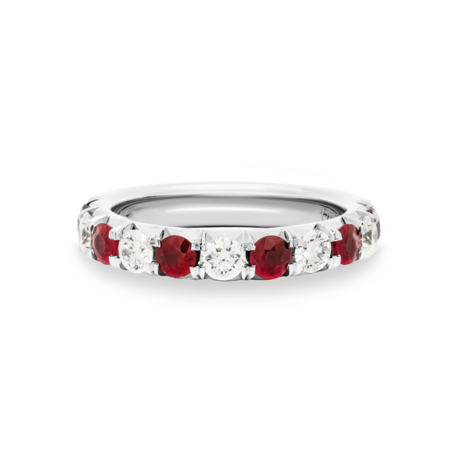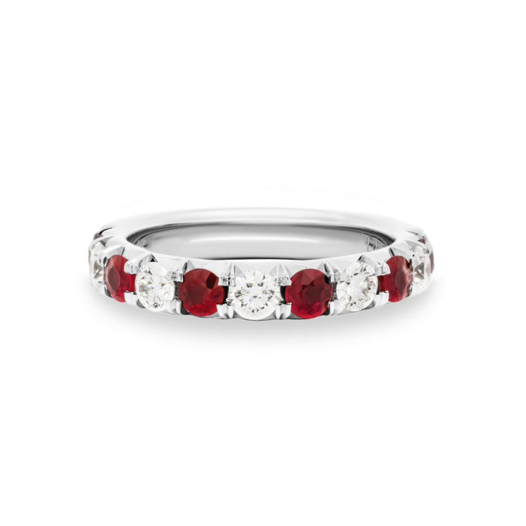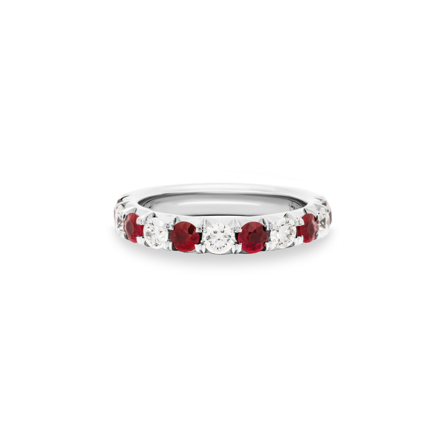 This 14K white gold band features alternating rubies and diamonds. The vivid red of the rubies contrasts beautifully with the sparkle of the diamonds, creating a bold yet refined look. This is a striking piece that pairs effortlessly with other rings or makes a statement on its own.Details