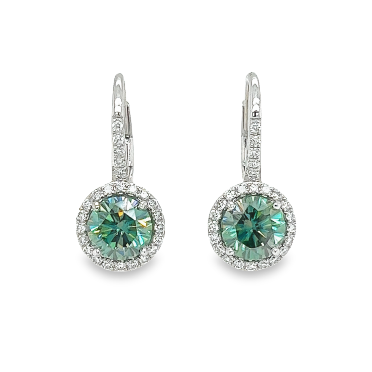Crafted in 14K white gold, these halo-style earrings showcase vibrant teal synthetic moissanite centers surrounded by a shimmering frame of round brilliant cut diamonds. The lever-back design adds both elegance and security, making them perfect for day-to-night wear.Details