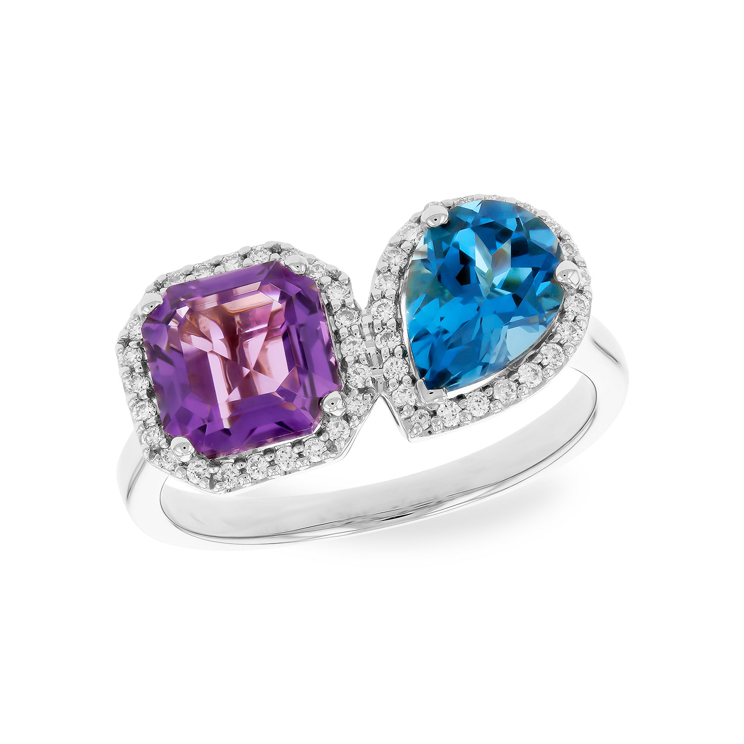 This 14K white gold ring showcases a striking duo of gemstones: one asscher cut amethyst and one pear shaped blue topaz. Each stone is framed by a halo of round brilliant cut diamonds, creating a vibrant and elegant contrast that makes a bold statement.Details