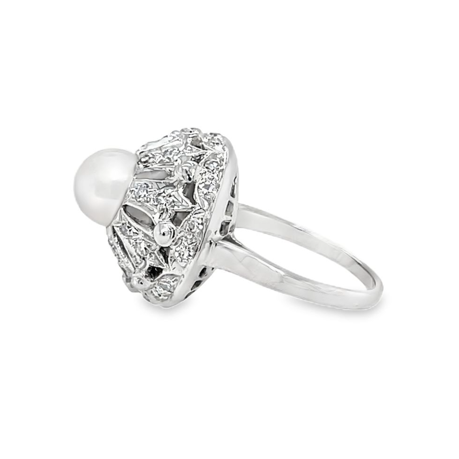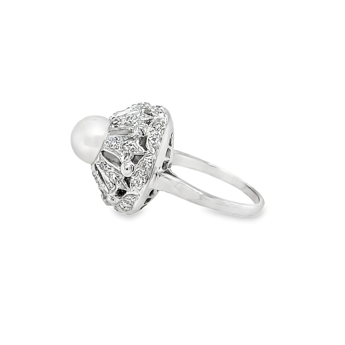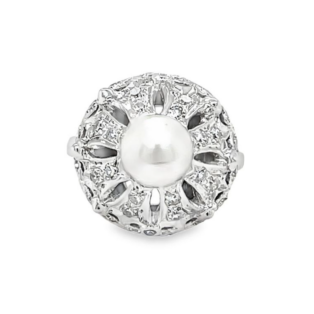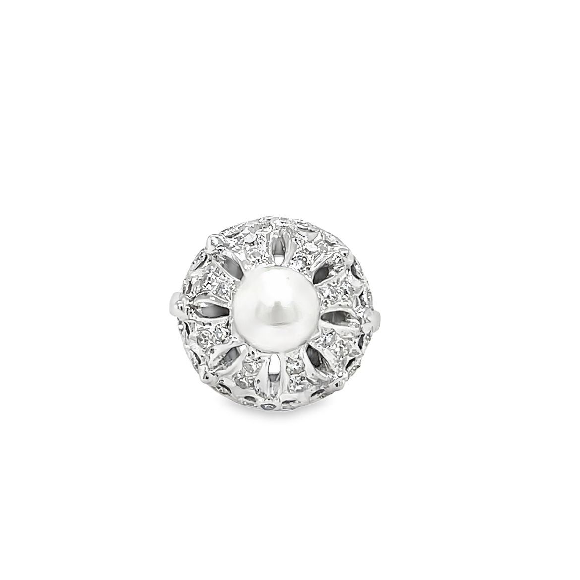 14K White Gold Vintage Cultured Akoya Pearl and Diamond Boule Cocktail Ring