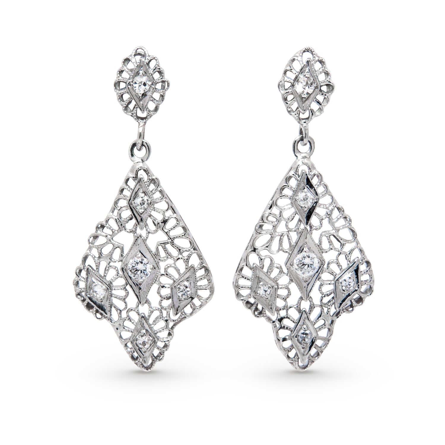 14 karat white gold estate dangle earrings set with 12 round single cut and round brilliant cut diamonds at 0.32 carat total weight with G - H - I color and SI1 - I1 clarity, equipped with friction style backs.Details