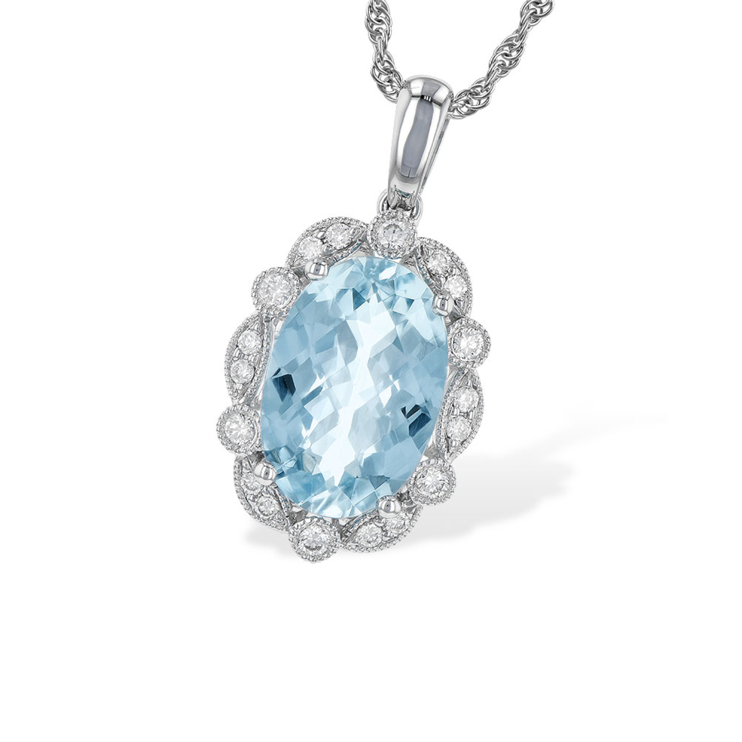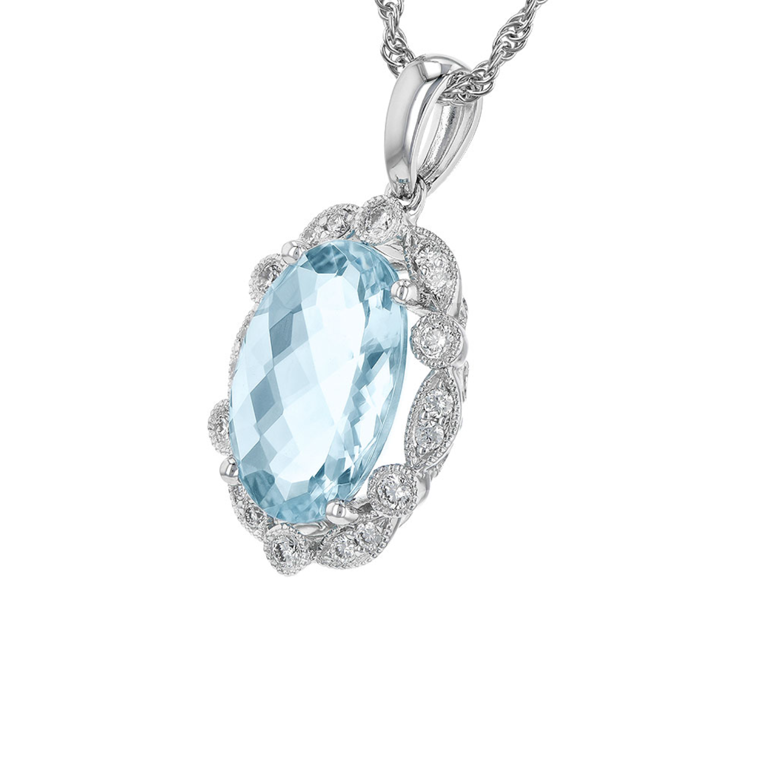 14 karat white gold vintage motif halo pendant set with one 2.40 carat oval aquamarine, accented with 18 round brilliant cut diamonds at 0.17 carat total weight with G color and SI1 clarity. This pendant is hung on an 18" 14 karat white gold 1.5 mm rope chain, equipped with a lobster claw style clasp.Details