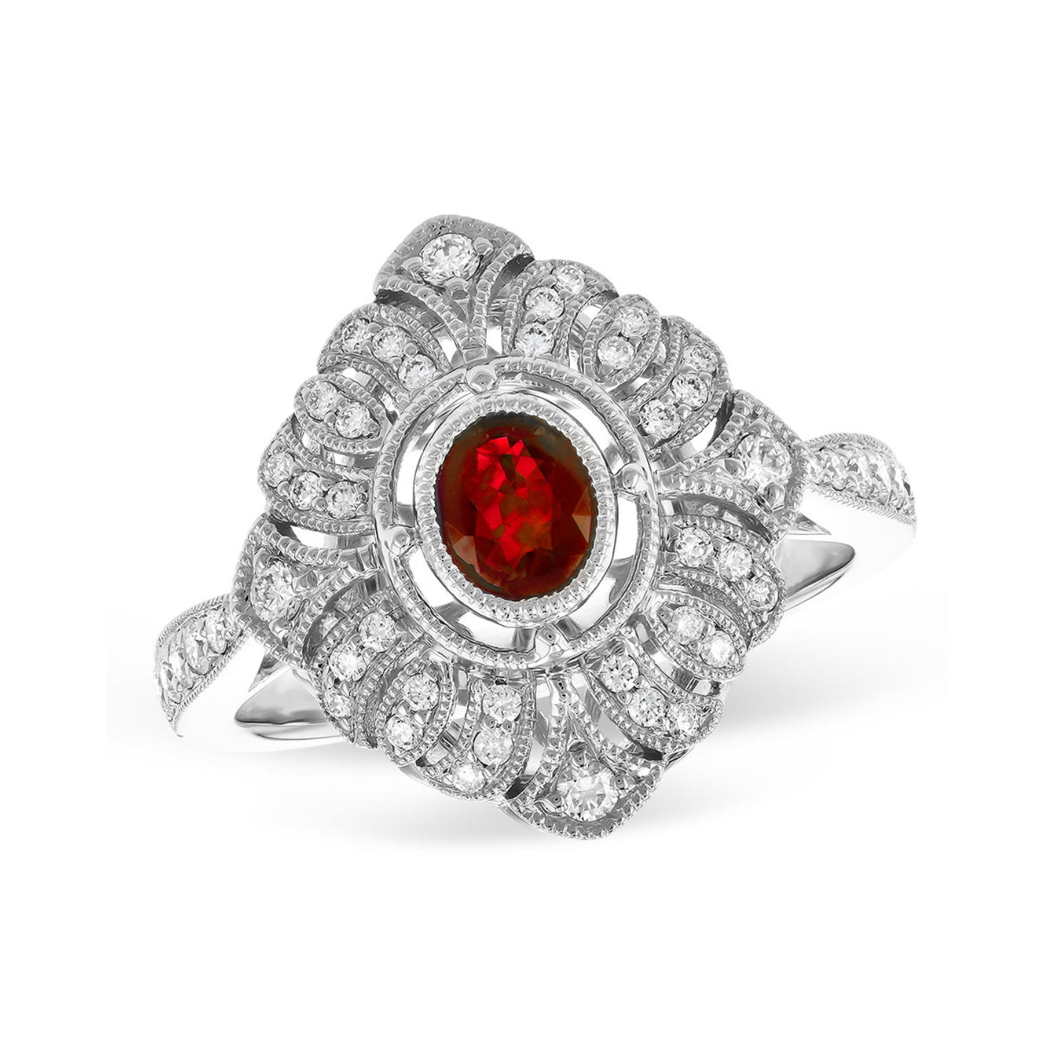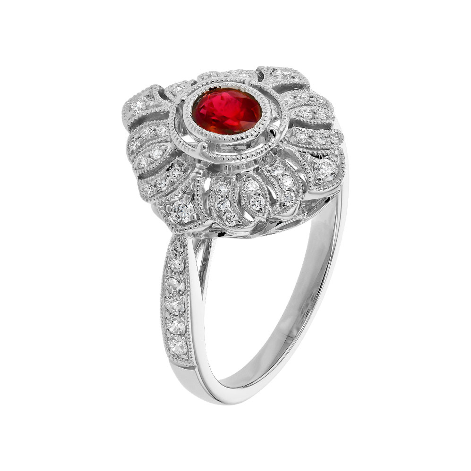 14 karat white gold vintage motif ring bezel set with one 0.42 carat oval ruby, accented with 48 round brilliant cut diamonds at 0.38 carat total weight with G color and SI1 clarity.Details