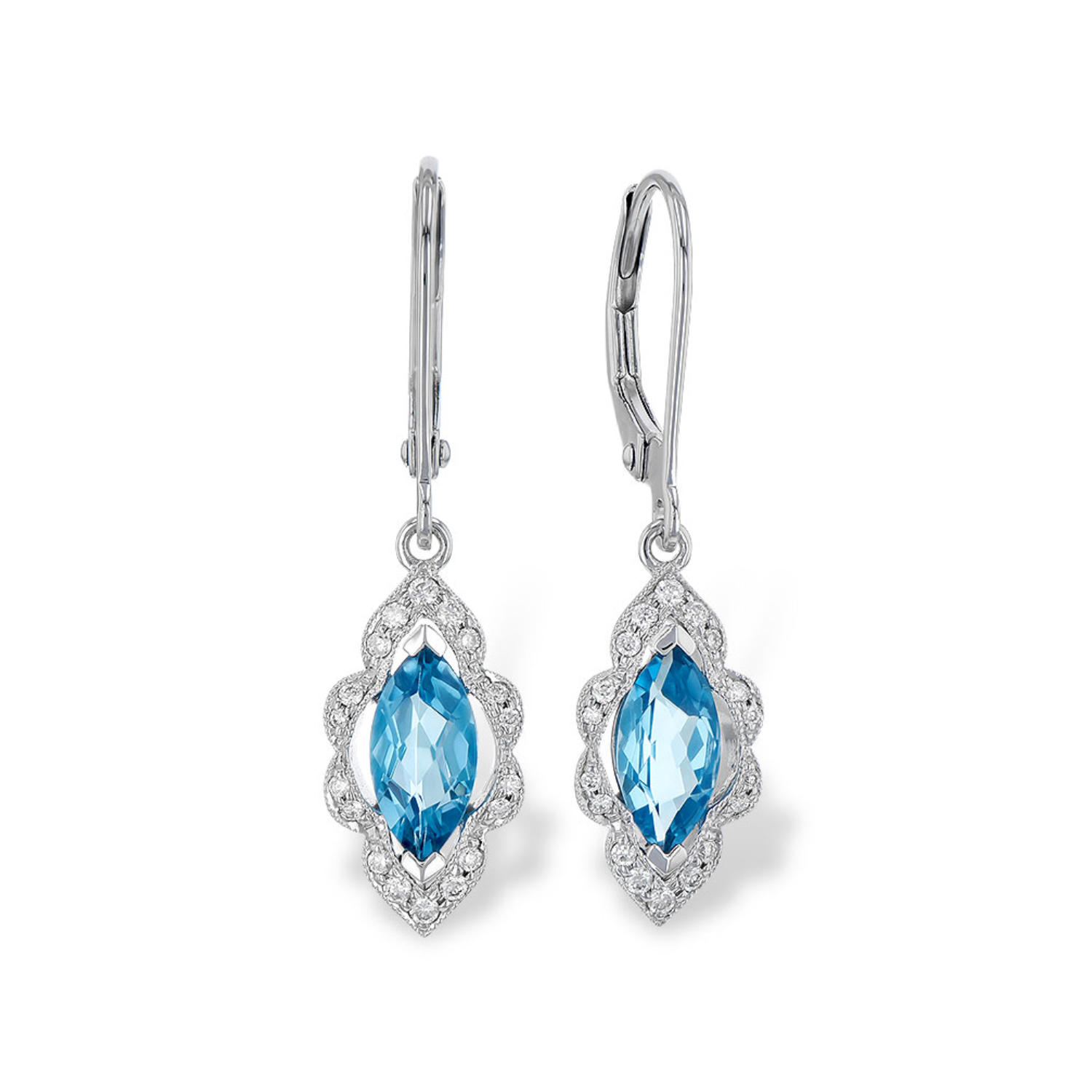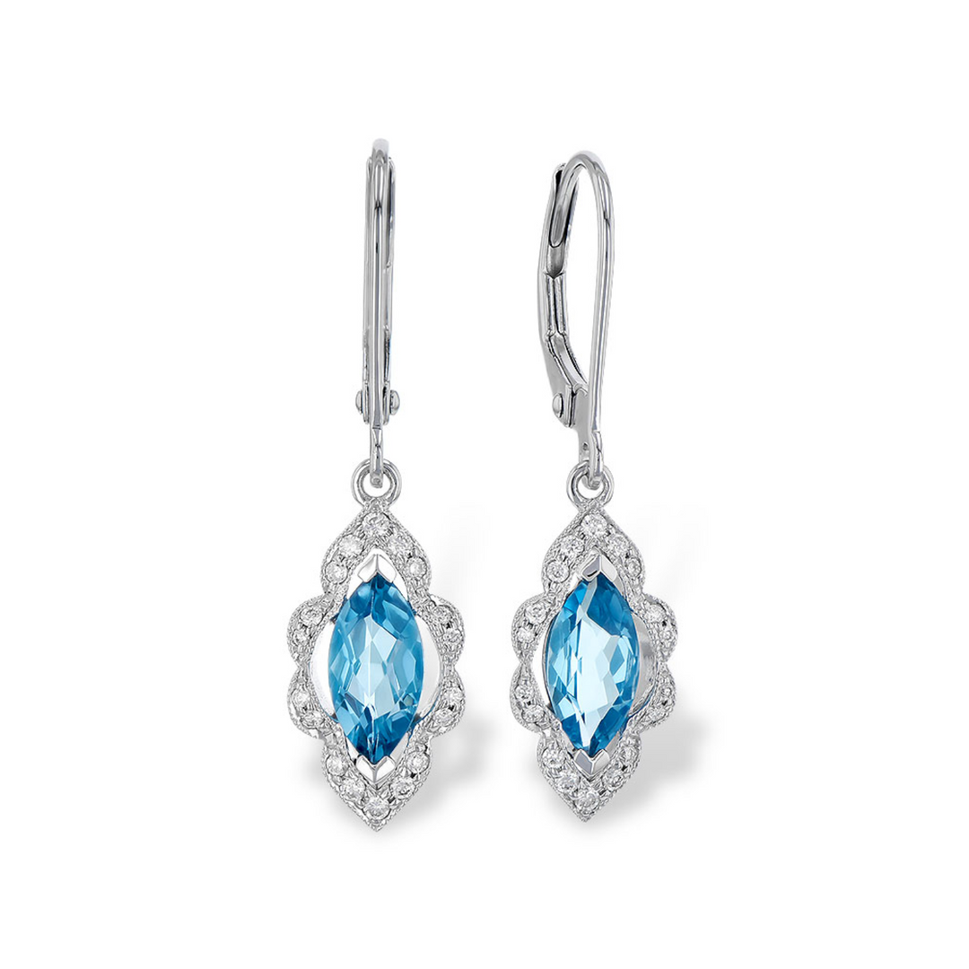 These 14K white gold vintage-style earrings feature elegant marquise cut Swiss blue topaz stones, each surrounded by a halo of round brilliant cut diamonds. Their intricate design and lever-back closures offer a timeless look with a touch of vibrant color and refined sparkle.Details