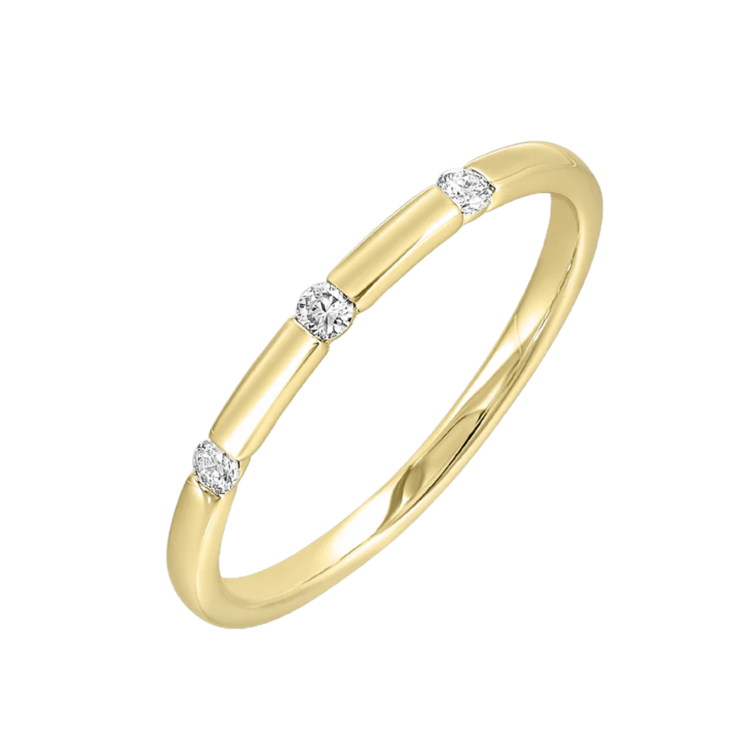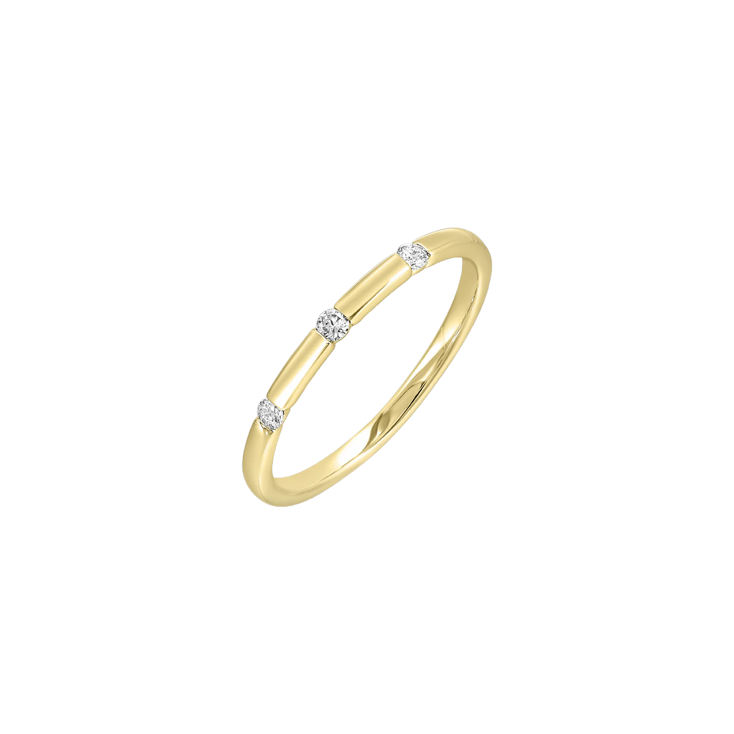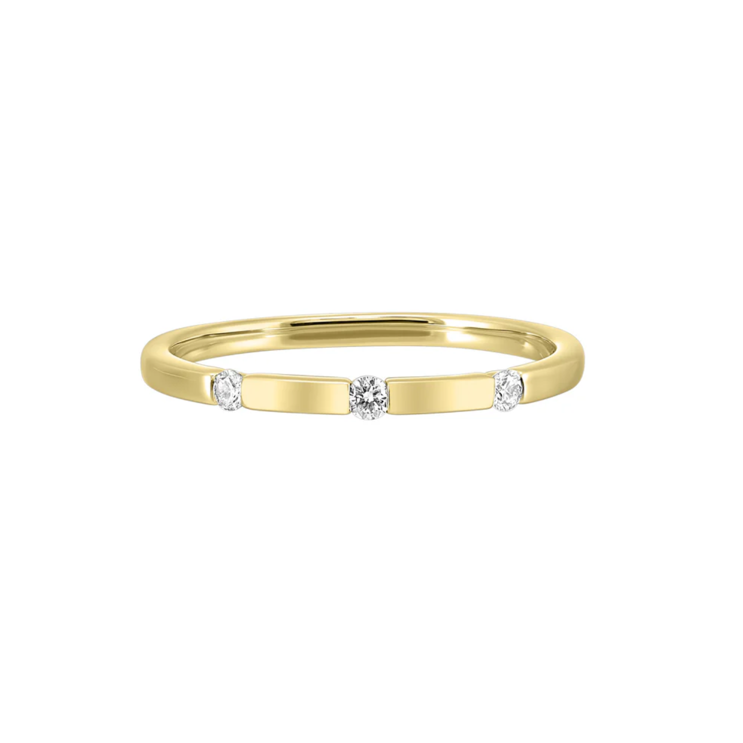 This 14K yellow gold stackable ring features polished gold bars interspersed with round diamonds for a clean, modern look. The minimalist design offers subtle sparkle and smooth symmetry, making it a perfect addition to any ring stack or a refined statement on its own.Details