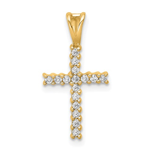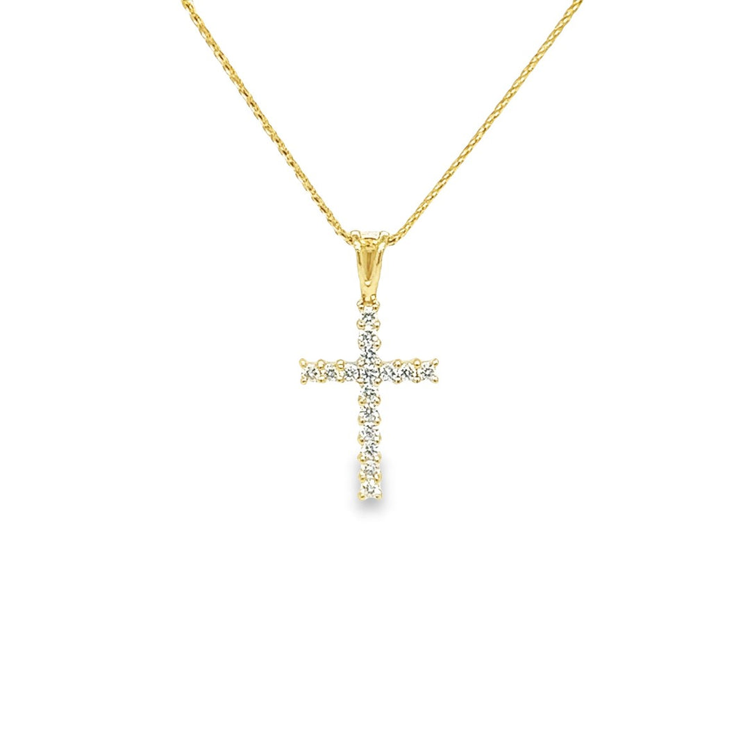 Celebrate a timeless symbol of faith with this 14K yellow gold lab grown diamond cross necklace. Crafted in radiant yellow gold, this necklace showcases a series of meticulously set lab grown diamonds, each capturing light to illuminate the classic cross design. Whether worn as a testament to one's faith or as a statement of elegance, this necklace merges spiritual significance with contemporary sparkle. A perfect blend of tradition and innovation, it's a cherished piece for both daily wear and special moments.Details