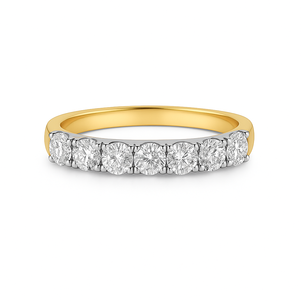 Crafted in 14K yellow gold with a rhodium-plated top, this wedding band features a row of round brilliant cut lab grown diamonds. A timeless design that balances warmth and brilliance, perfect for pairing with an engagement ring or worn on its own.Details