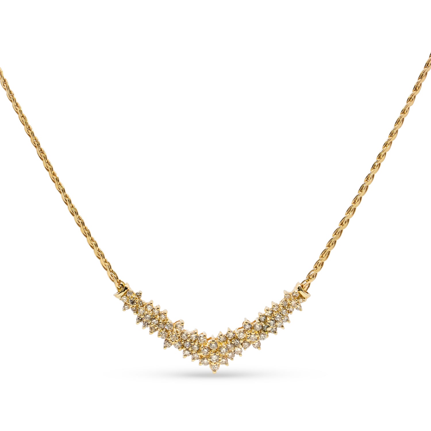 This 14K yellow gold estate necklace showcases a striking chevron design set with clusters of round brilliant cut diamonds, creating a radiant focal point. The piece is finished with a secure lobster claw clasp, blending vintage charm with timeless sophistication.Details