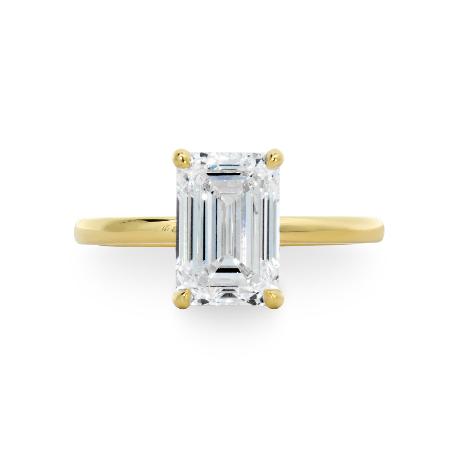 This 14K yellow gold engagement ring showcases an emerald cut lab grown diamond in a classic four-prong setting. The clean, minimalist design highlights the diamond's striking geometric beauty and elegant rectangular silhouette. This ring is a timeless and sophisticated choice to mark a meaningful moment.Details
