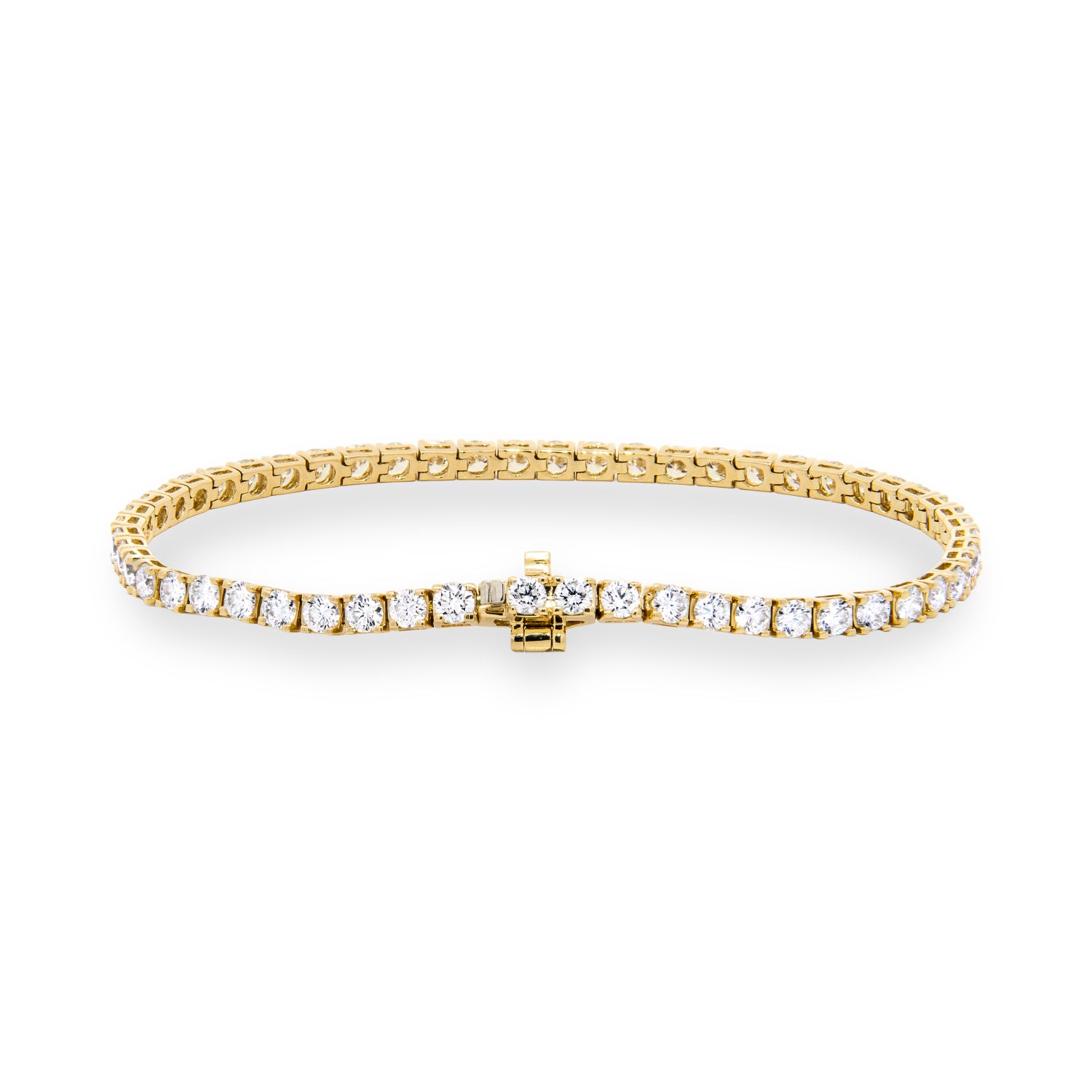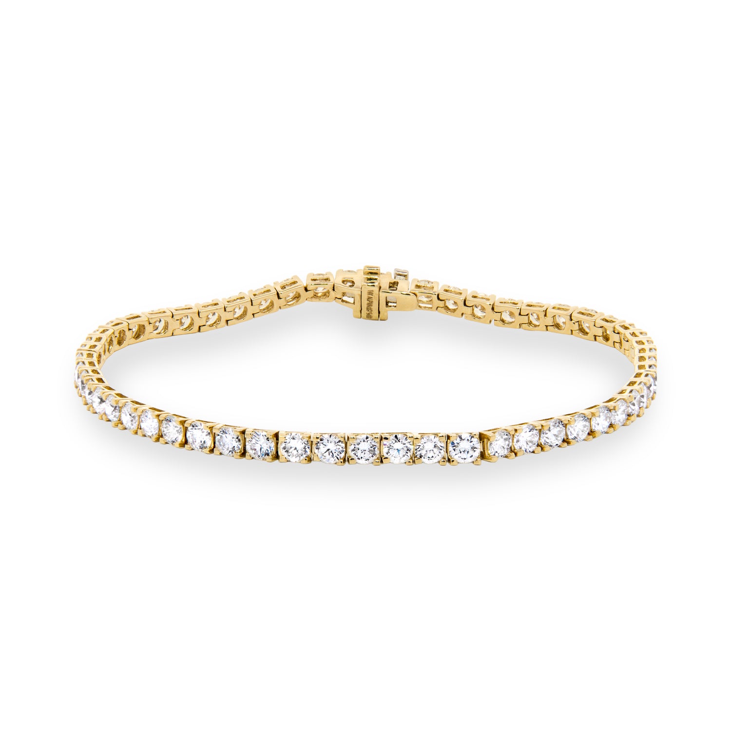 7" 14 karat yellow gold tennis bracelet set with 55 round brilliant cut lab grown diamonds at 5 carat total weight with F color and VS1 - VS2 clarity, equipped with a box style clasp and under folder style safety mechanism.Details