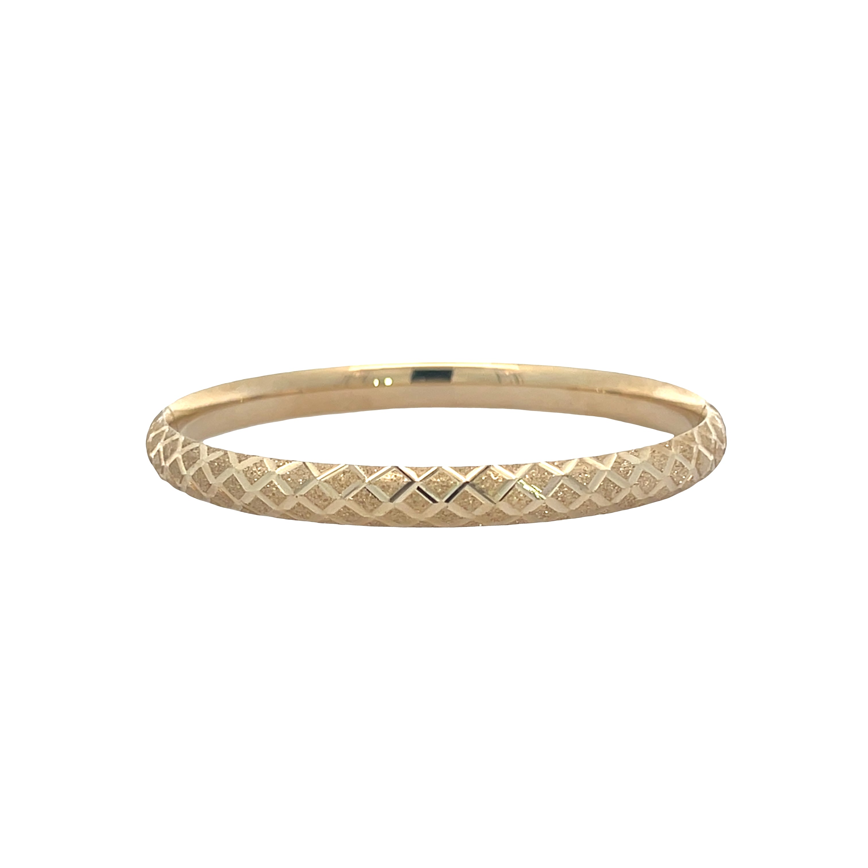 This estate 14K yellow gold bangle features a hollow hinged construction with a beautiful diamond cut finish that creates stunning light reflection and texture. The hinged design allows for easy wearing while maintaining the sleek, continuous appearance of a traditional bangle. This piece is a polished classic that delivers substantial presence with comfortable everyday wearability.Details