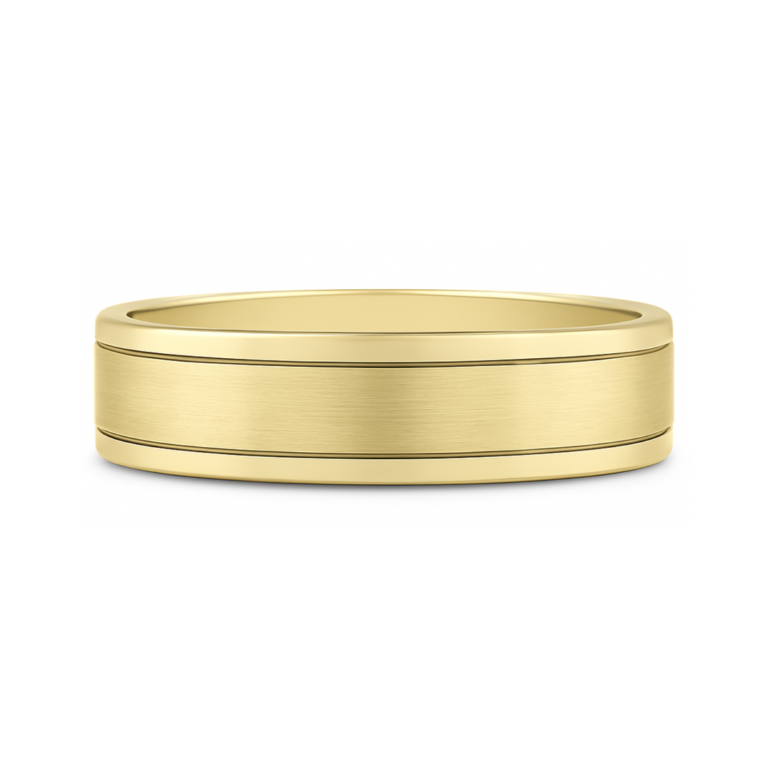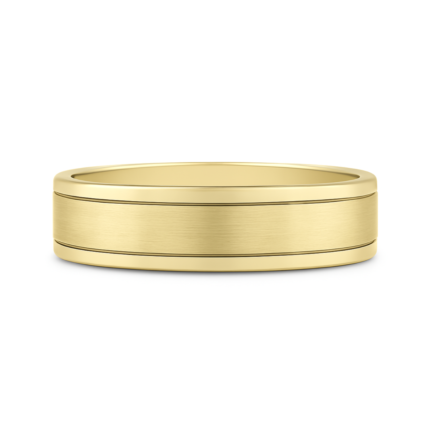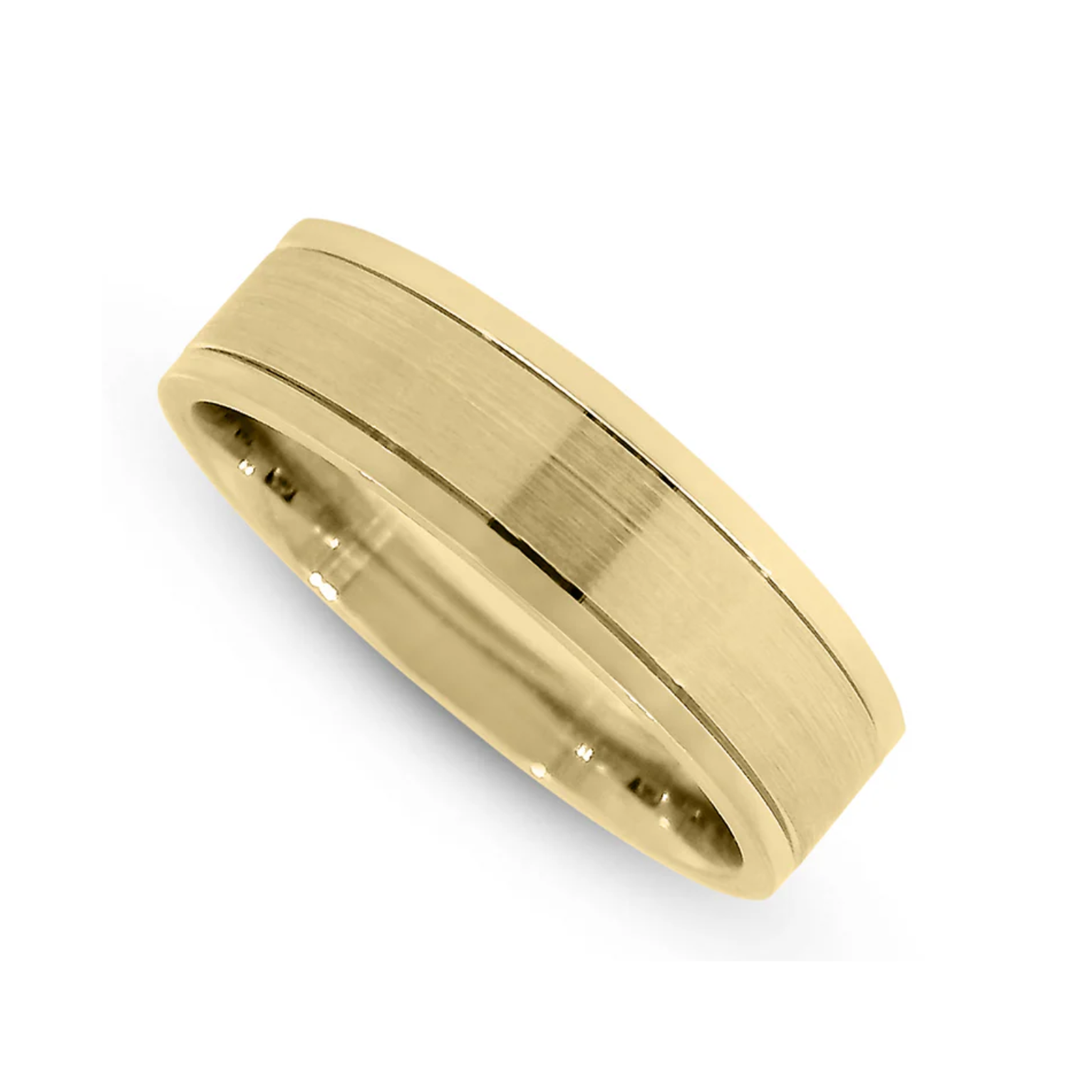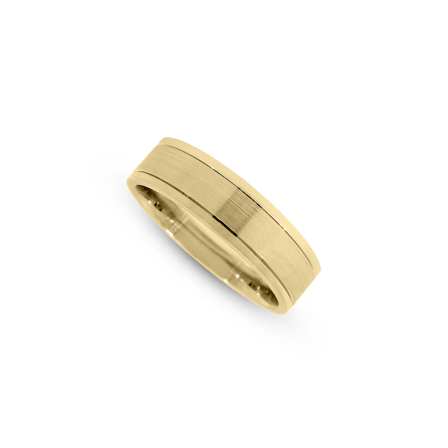 14 karat yellow gold 6 mm carved comfort fit wedding band with a satin finish center and high polished flat edge.Details