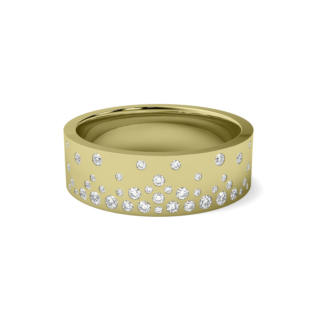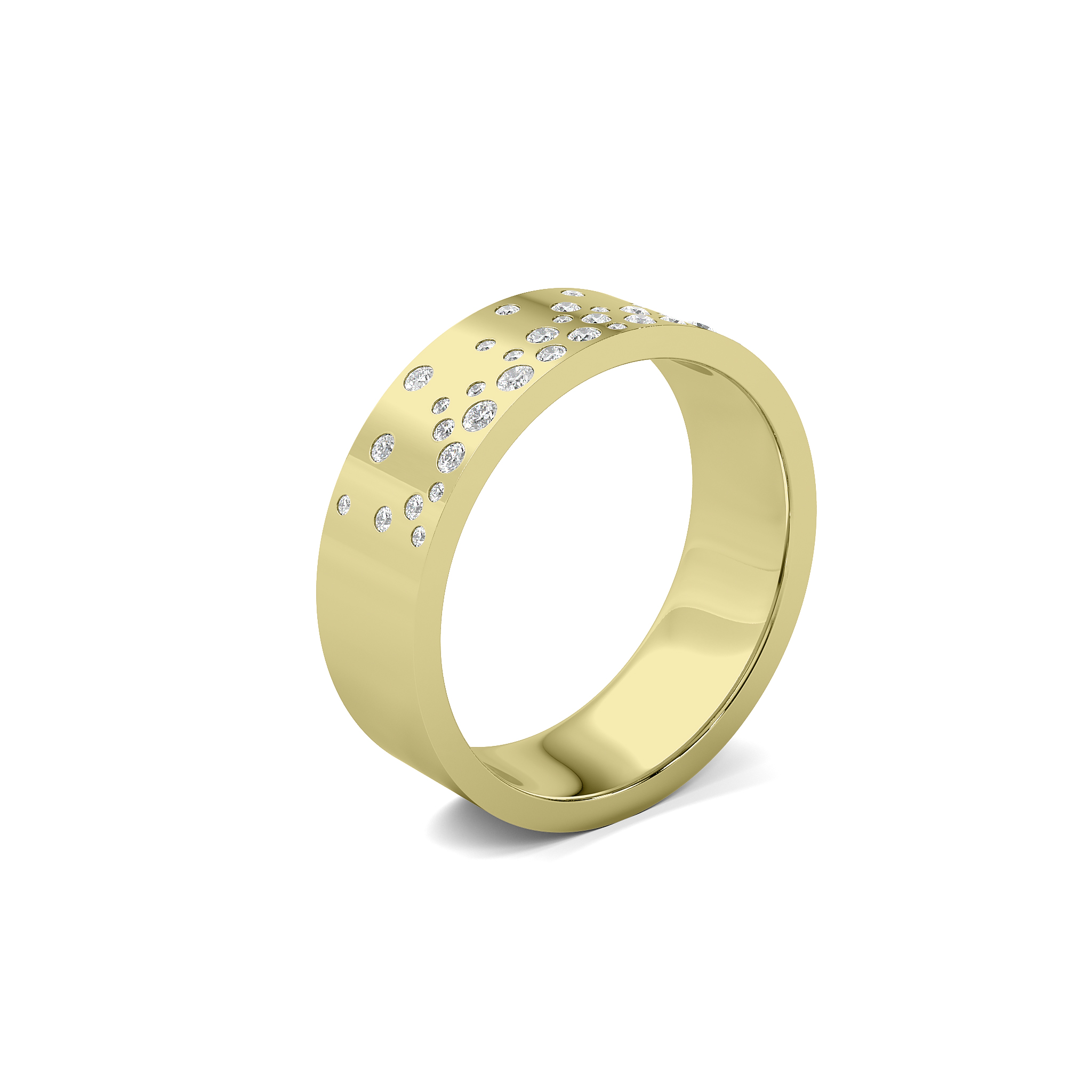 This 14K yellow gold band features a flat comfort fit design set with scattered round brilliant cut diamonds. The scattered setting adds a distinctive look to this modern band.Details