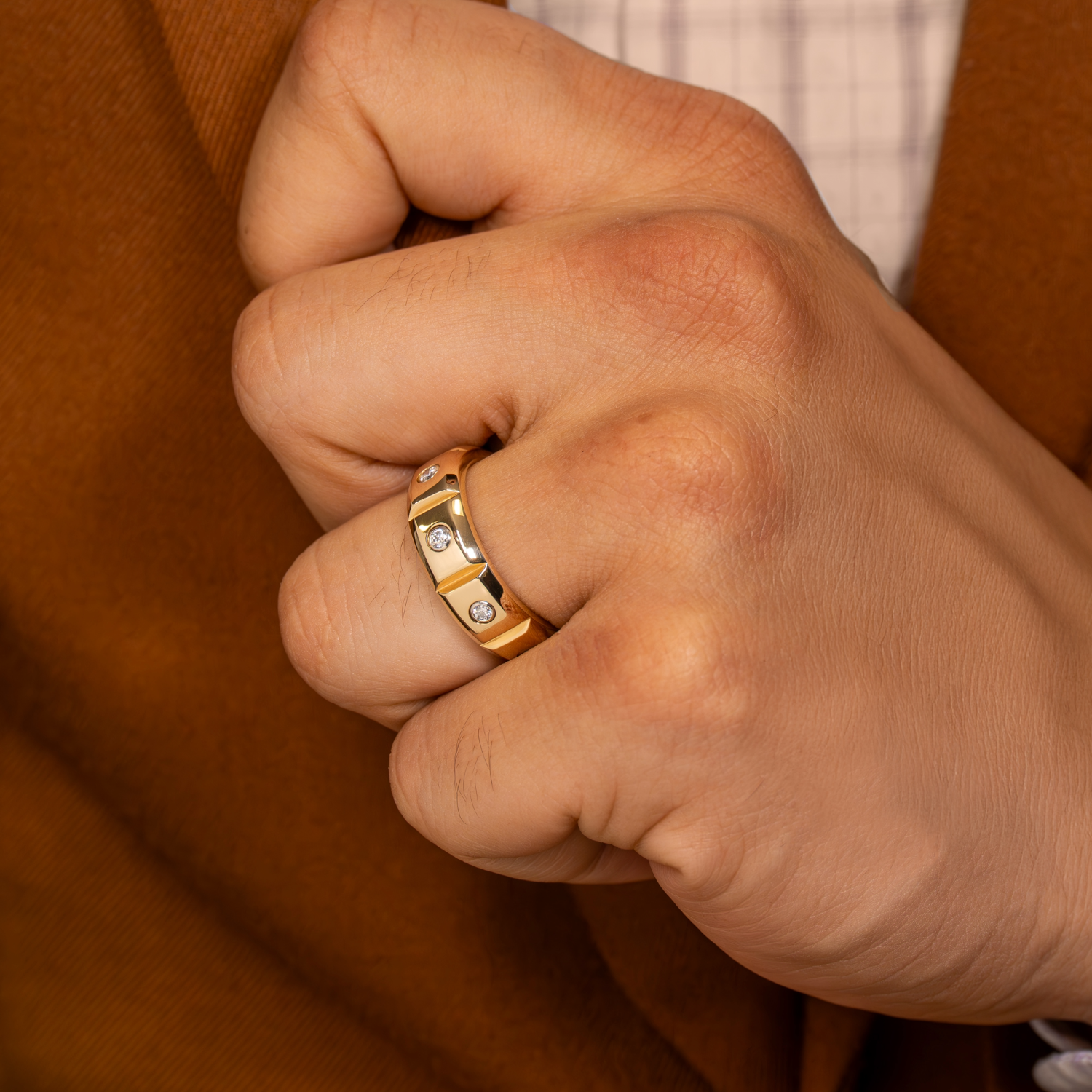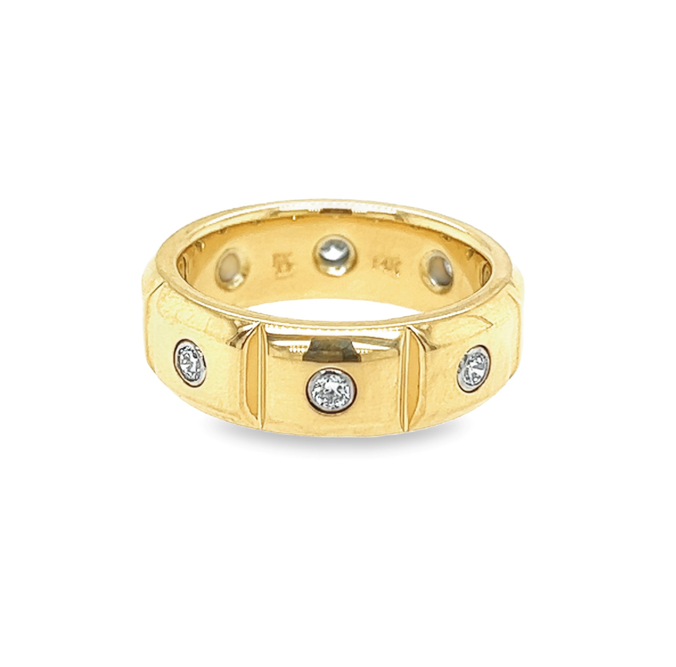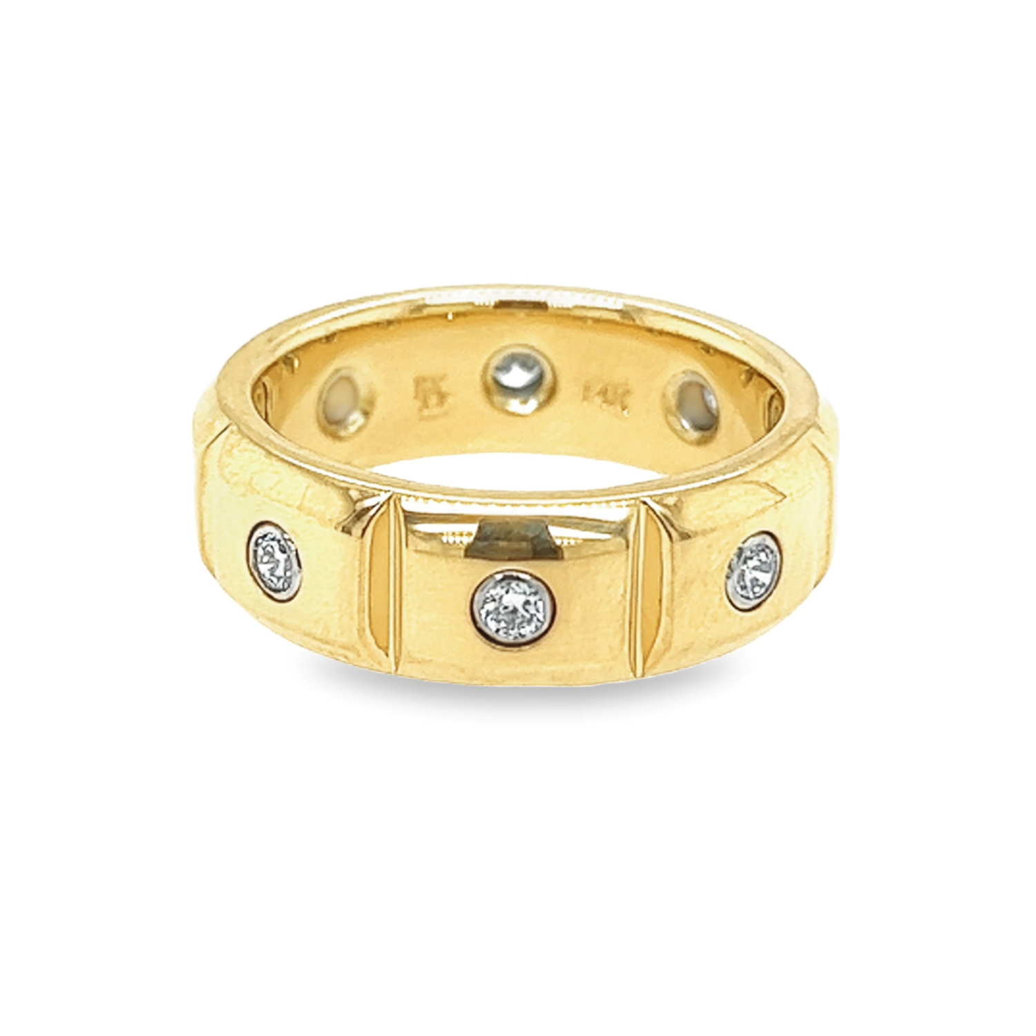 Showcasing a powerful fusion of meticulous craftsmanship and contemporary design, this Men's 14K yellow gold Bensel Made segmented eternity band stands out as a statement of elegance. Each distinct section of the band holds a dazzling round brilliant cut diamond, set securely within a lustrous platinum bezel. The contrast between the rich yellow gold and the gleaming platinum accentuates the brilliance of the diamonds, making it a distinct and sophisticated choice. True to the Bensel legacy, this ring promises both quality and style, making it a timeless piece for the modern man.Details