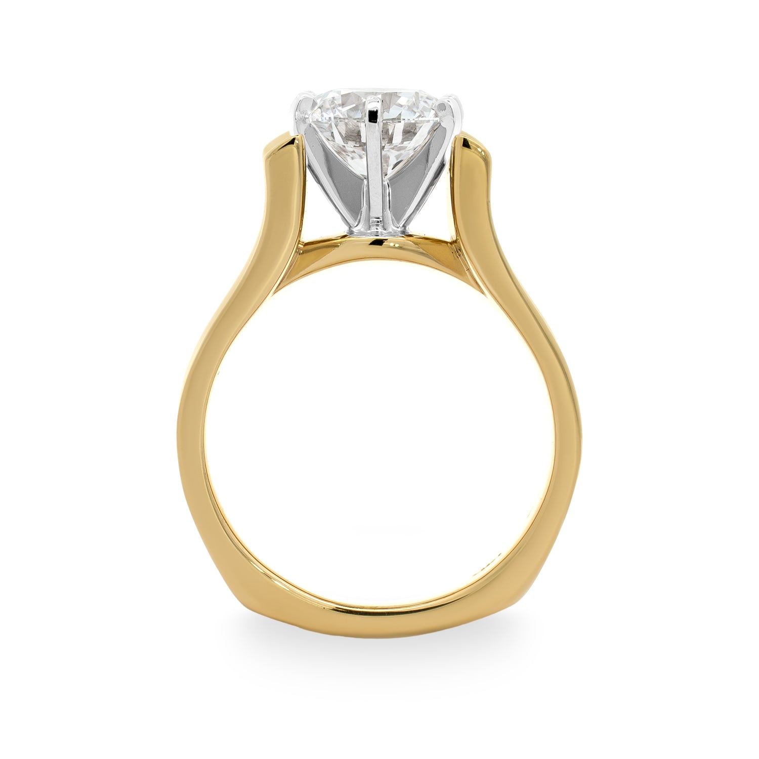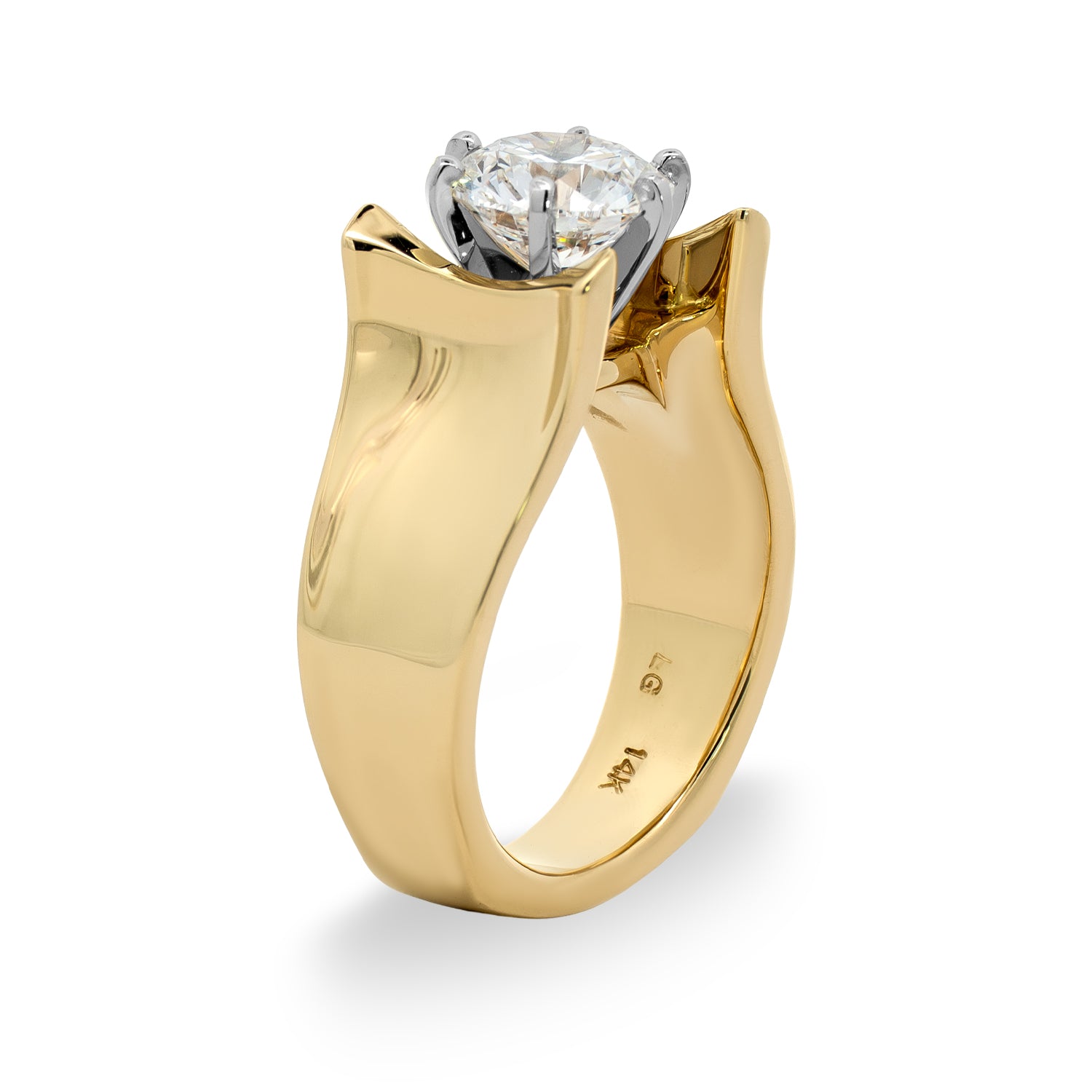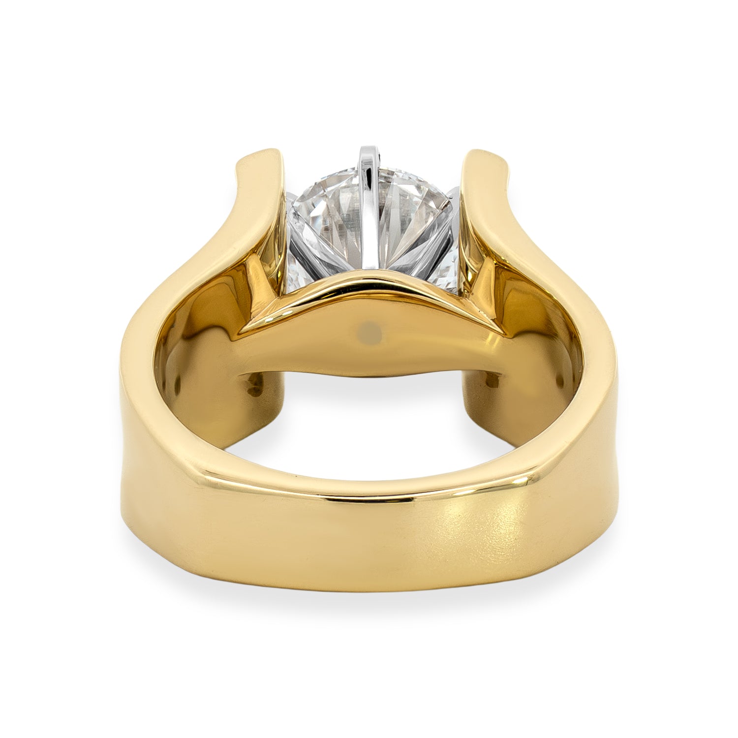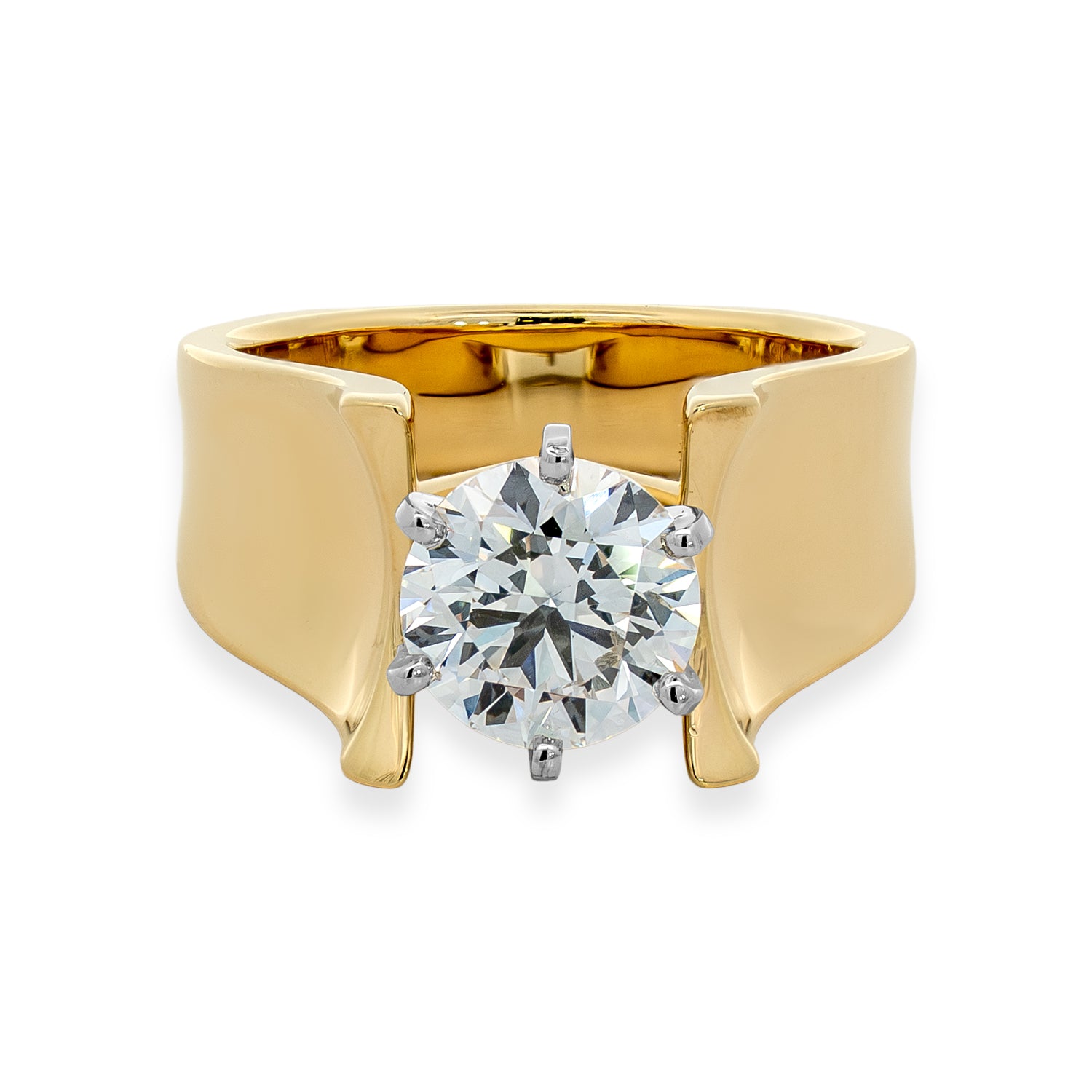 Showcasing an exquisite design, this 14K yellow gold Bensel Made wide solitaire ring features a stunning round brilliant cut lab grown diamond as its centerpiece. Whether worn as an engagement ring or a statement piece, its unique craftsmanship and brilliance make it a cherished addition to any collection.Details