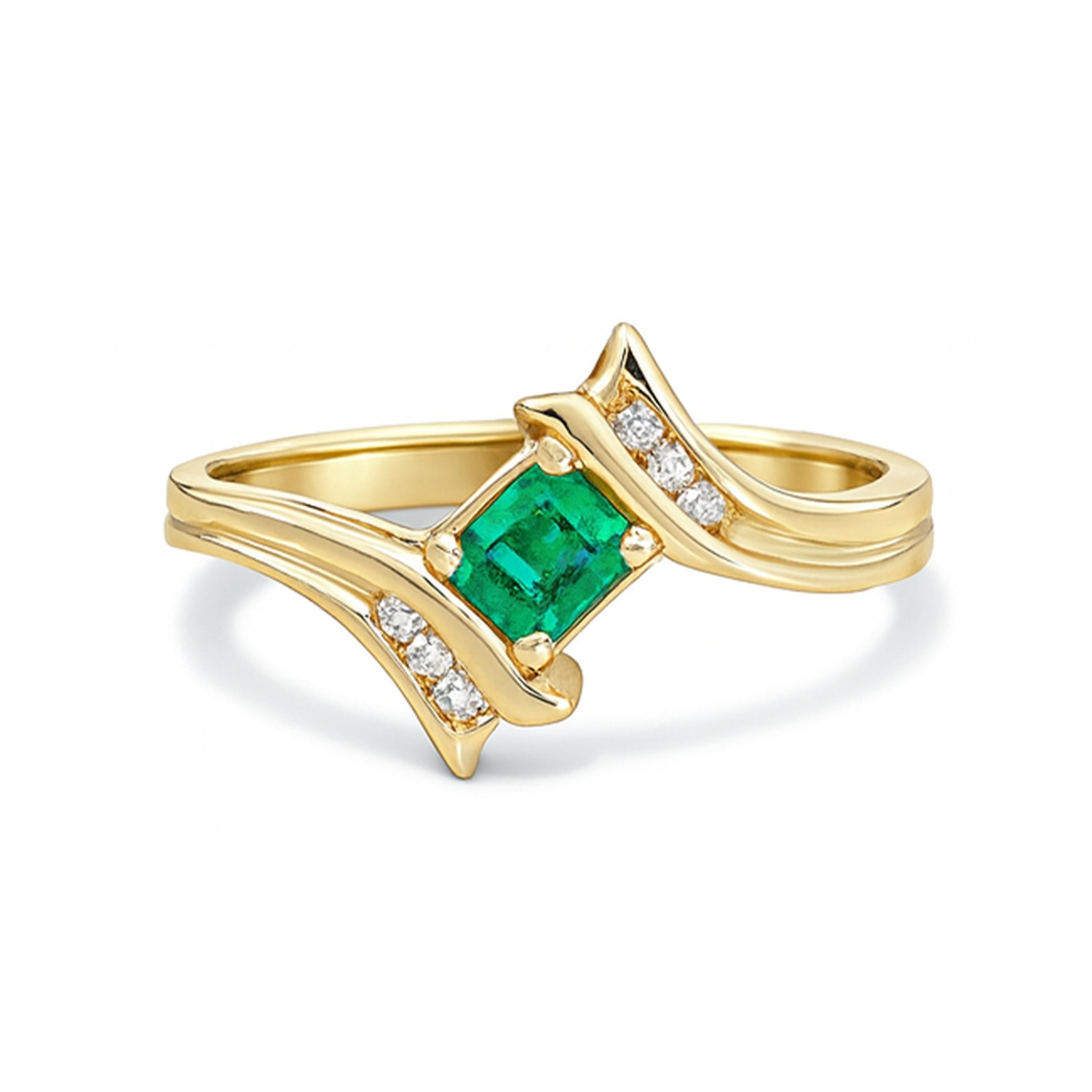 This 14K yellow gold estate bypass style ring showcases a vibrant emerald cut emerald at its center, accented by six round diamonds. The flowing lines of the band highlight the rich green hue, creating a refined and elegant look.Details