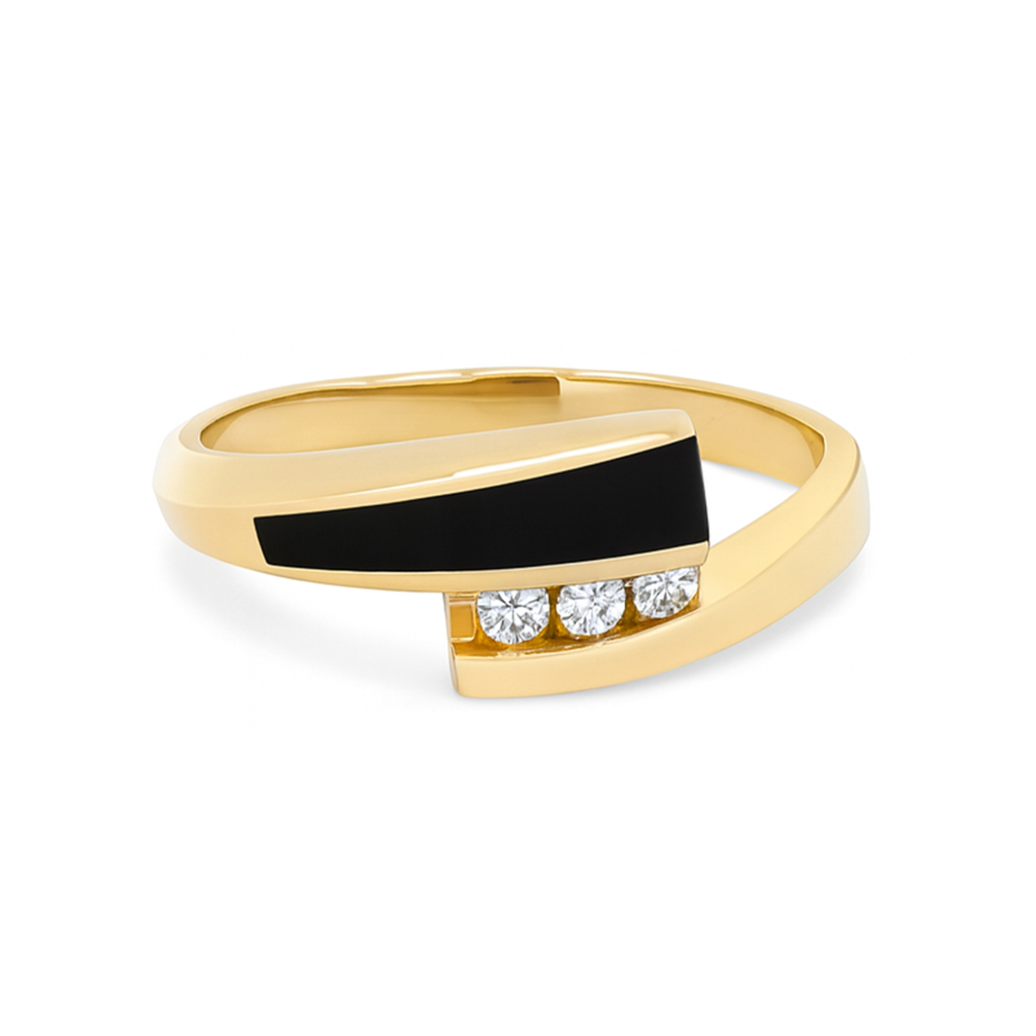 This 14K yellow gold estate bypass style ring features a sleek onyx inlay paired with three round brilliant cut diamonds. The bold contrast between the deep black onyx and the bright diamonds creates a striking, modern look.Details