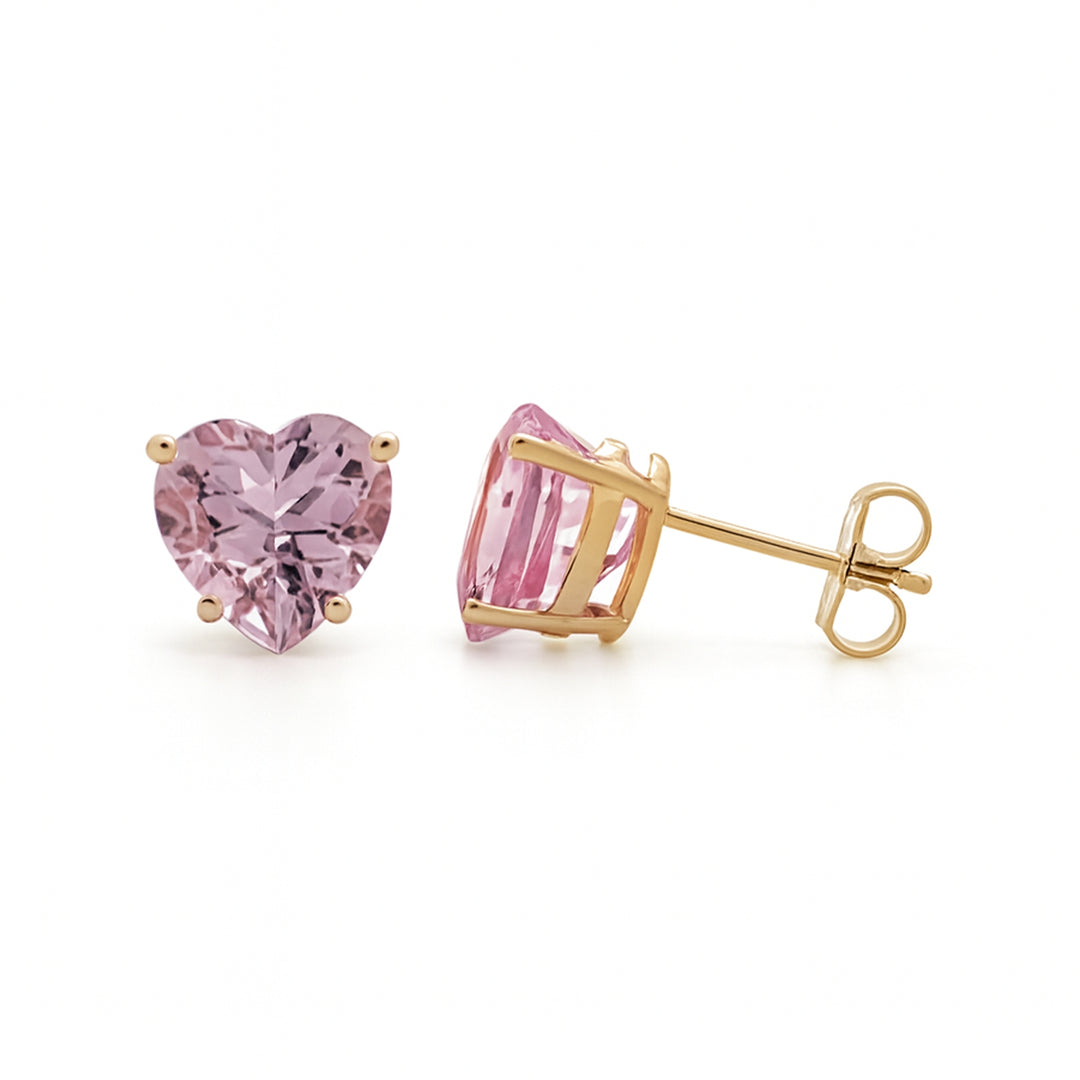 14 karat yellow gold estate stud style earrings set with two 10 x 10 mm heart shaped coated pink topaz, equipped with friction style backs.Details