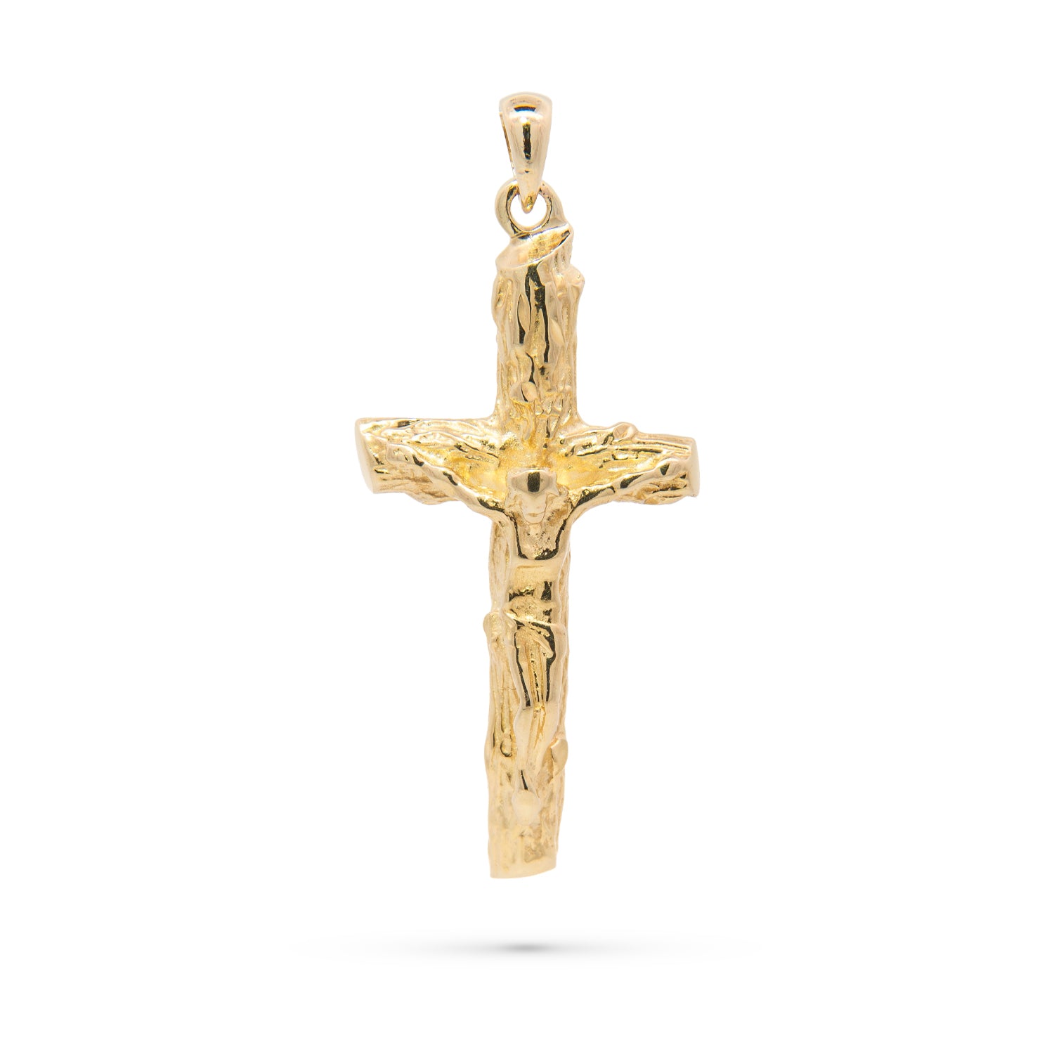 This 14K yellow gold estate crucifix pendant features a detailed depiction of Christ on a textured cross. Its intricate craftsmanship and warm gold tone give it a meaningful and traditional presence.Details