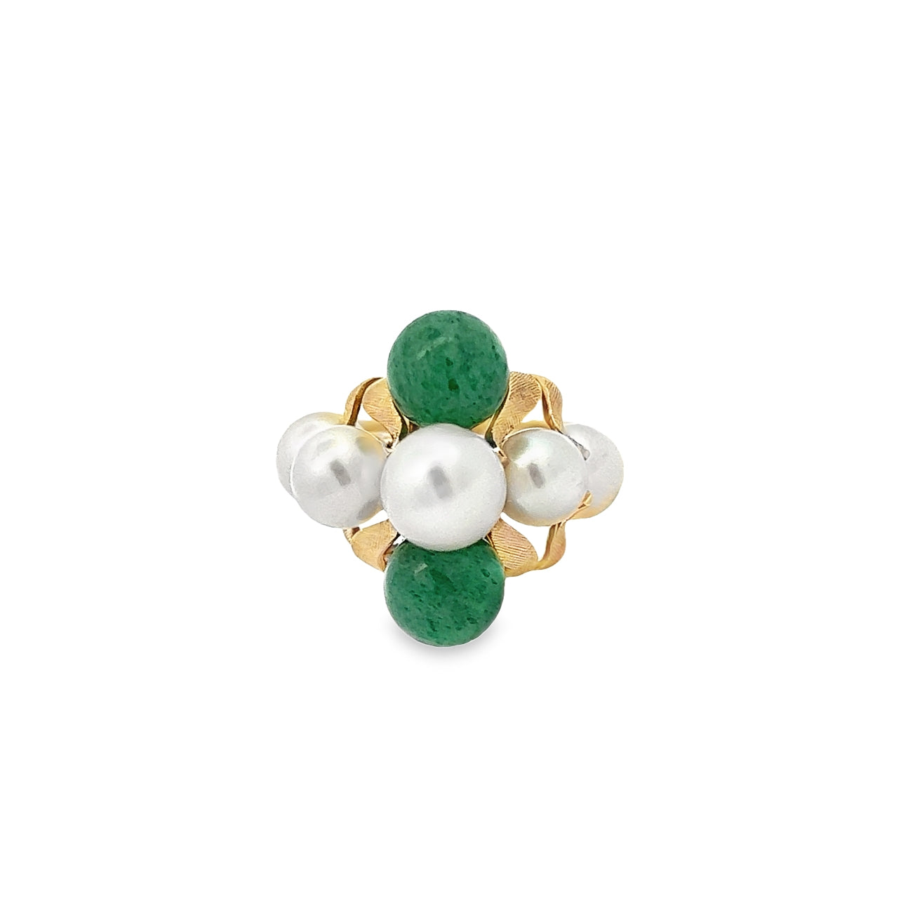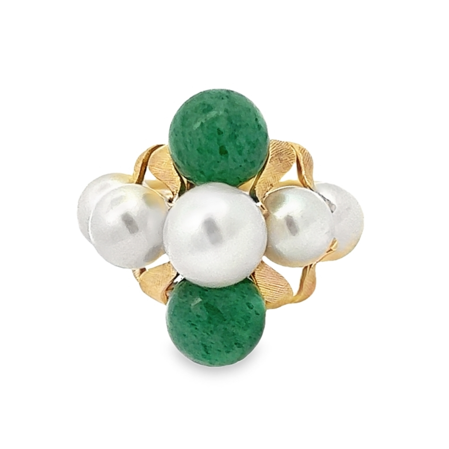 Indulge in the unique charm of our 14K yellow gold estate ring, set with cultured Akoya pearls and vibrant jadeite beads. This exquisite piece features a captivating design where lustrous pearls are beautifully contrasted with the rich green hues of jadeite, all set in a meticulously crafted 14K yellow gold ring. Perfect for adding a touch of vintage elegance to any outfit, this estate ring is a standout addition to any jewelry collection.Details