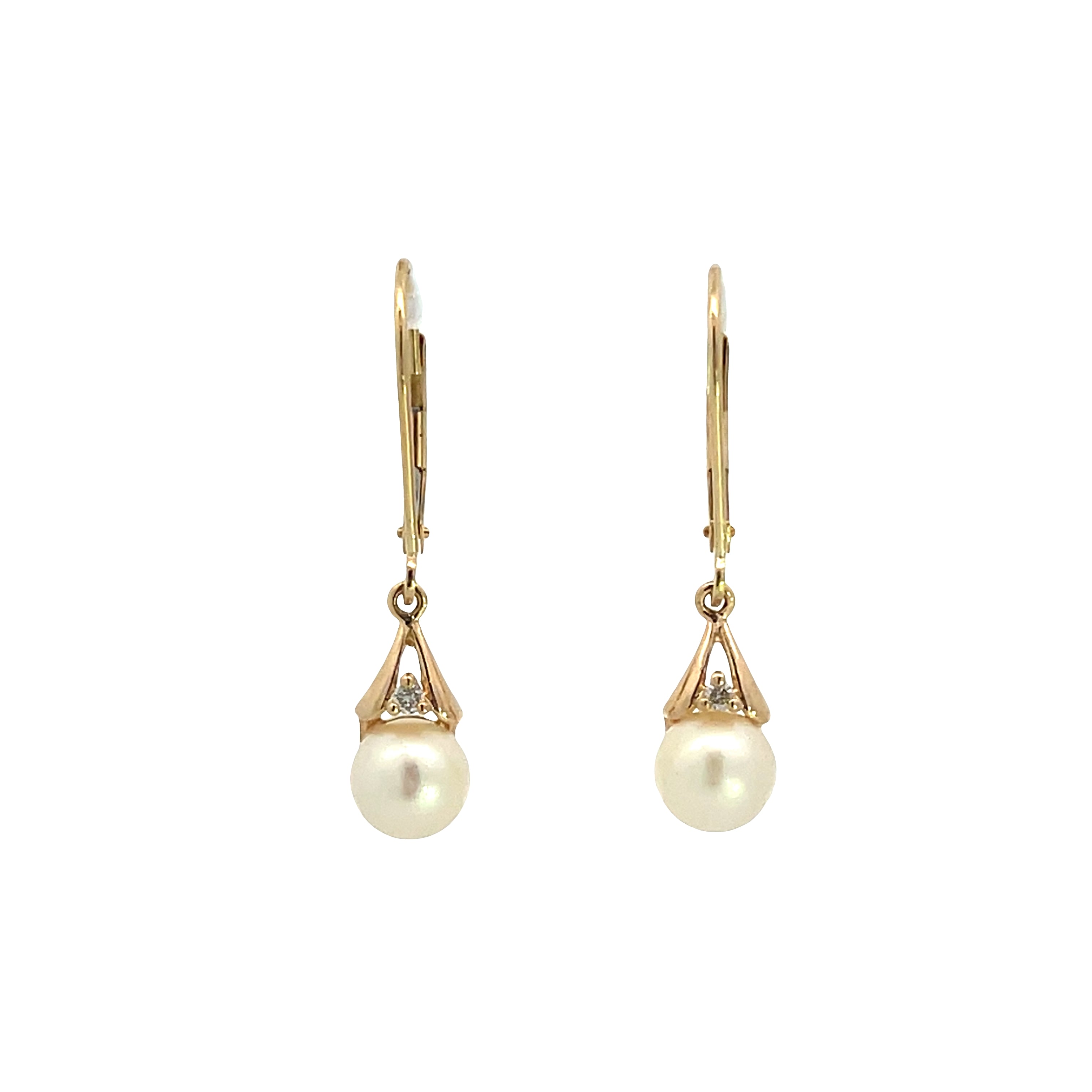 These estate 14K yellow gold dangle earrings feature cultured freshwater pearls accented with round brilliant cut diamonds. The secure lever-back closures provide confidence for everyday wear while the classic drop design adds graceful movement to the overall silhouette. These earrings are a perfect balance of understated luxury and timeless appeal that enhances any jewelry wardrobe.Details