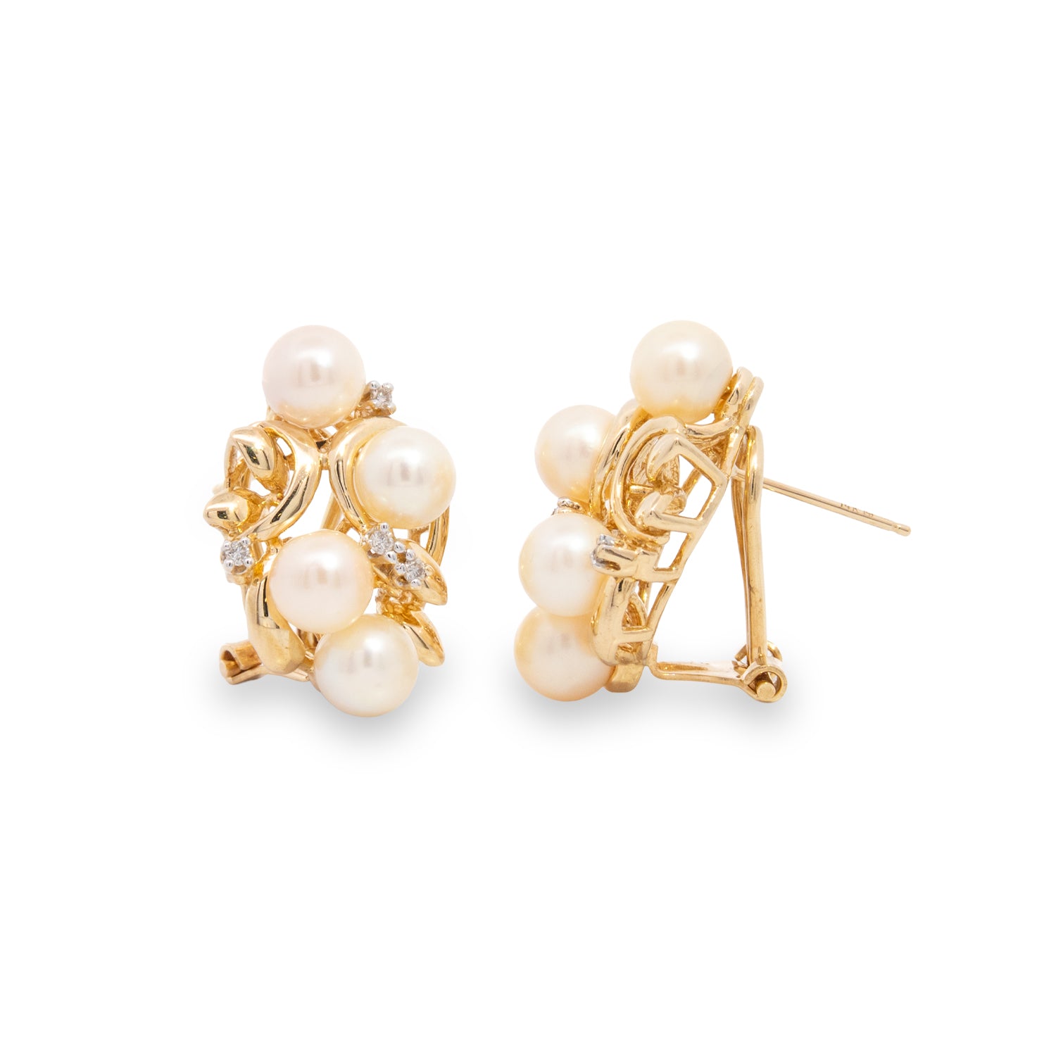 14 karat yellow gold estate pearl earrings set with eight 5.5 - 6.0 mm near round cultured freshwater pearls, accented with eight round brilliant cut diamonds at 0.08 carat total weight with H - I - J color and SI1 - SI2 clarity, equipped with omega style backs.Details