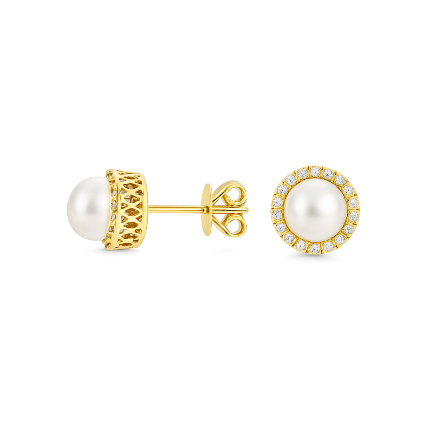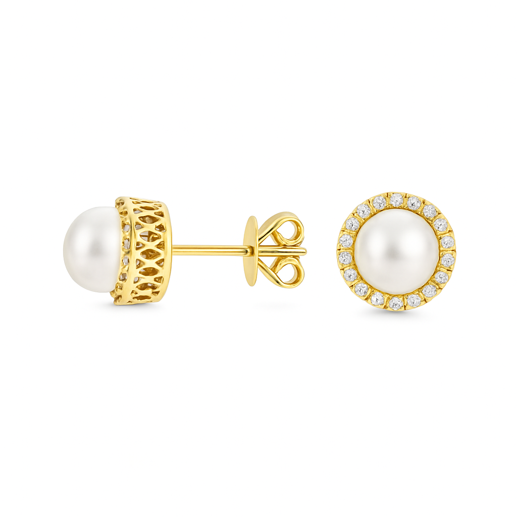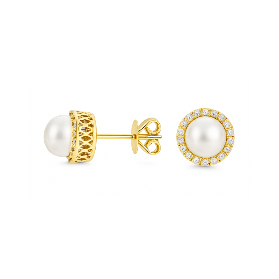 These 14K yellow gold earrings feature lustrous cultured freshwater pearls, each encircled by a halo of sparkling diamonds. A timeless and elegant choice, perfect for adding a touch of sophistication to any ensemble.Details