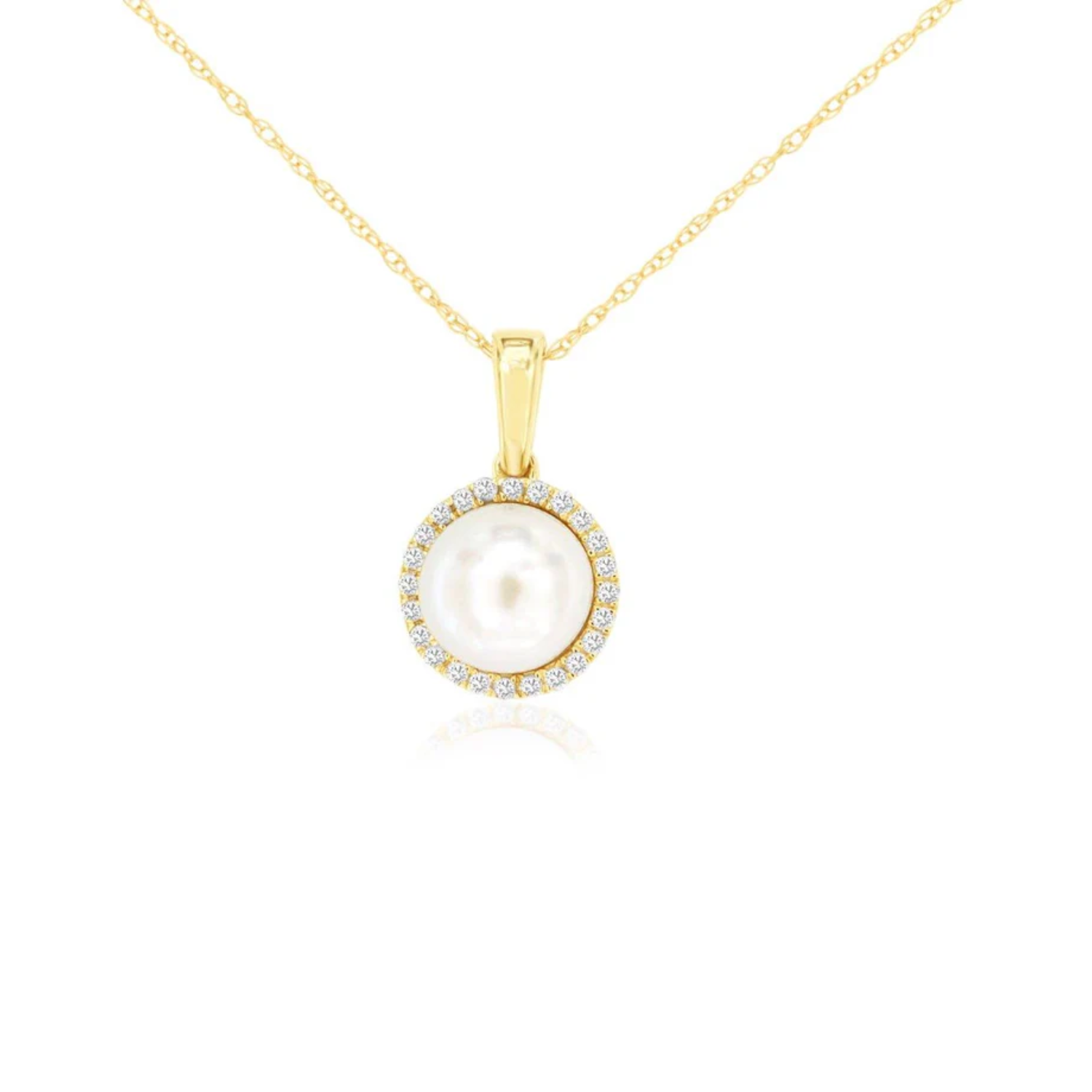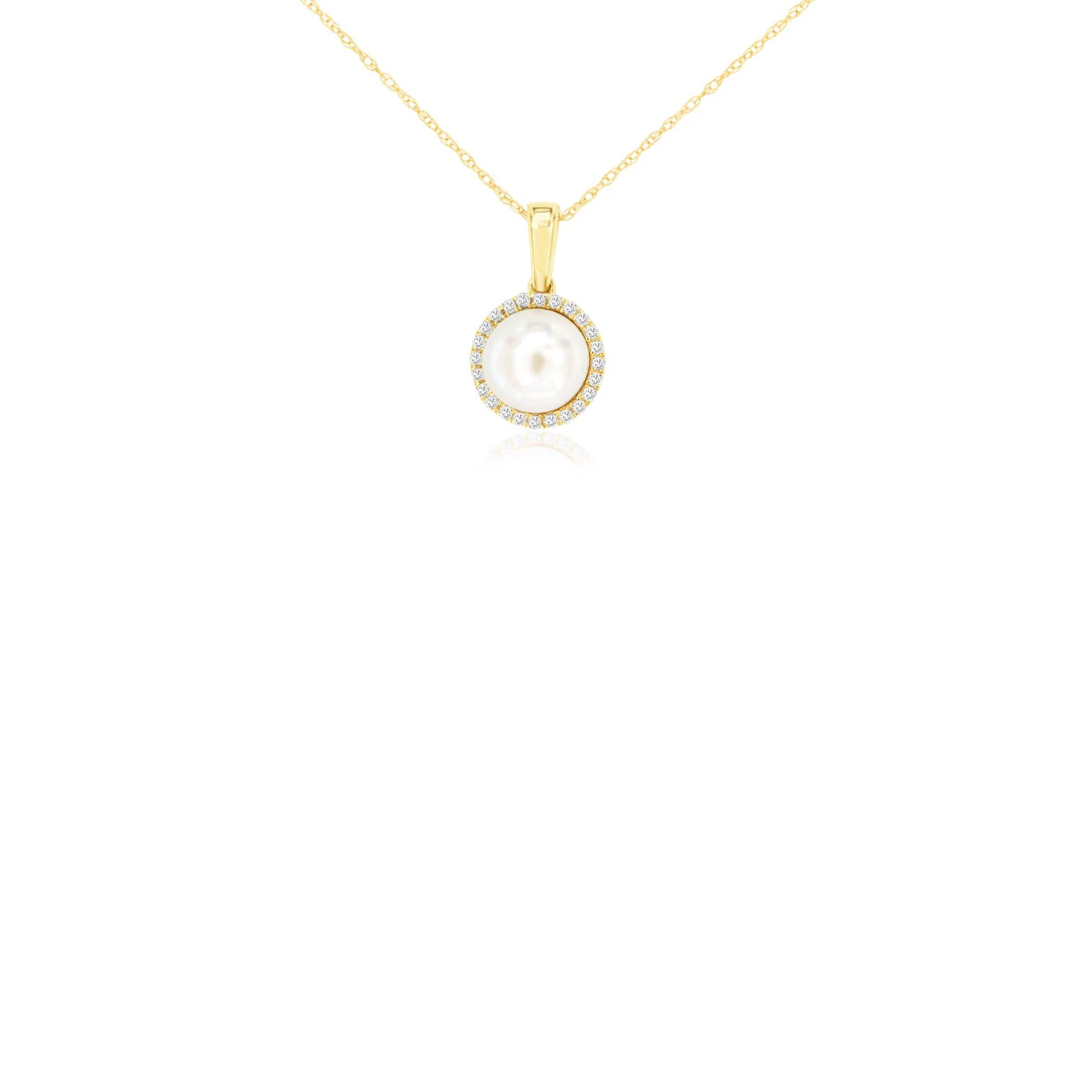 This 14K yellow gold necklace features a lustrous cultured freshwater pearl surrounded by a dazzling halo of diamonds. This elegant piece offers timeless sophistication, making it perfect for both everyday wear and special occasions.Details