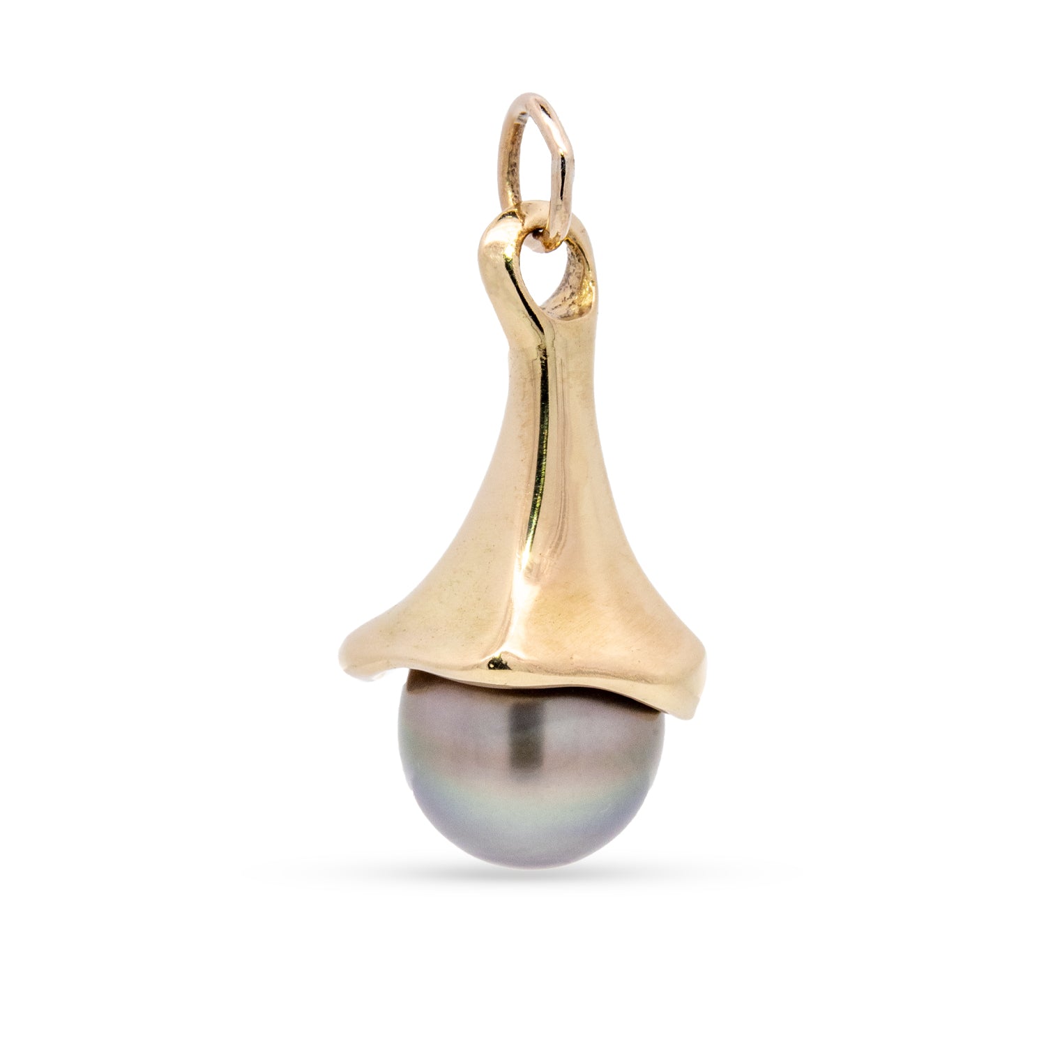14 karat yellow gold estate drop style pendant set with one 11.5 - 12 mm cultured Tahitian pearl.Details