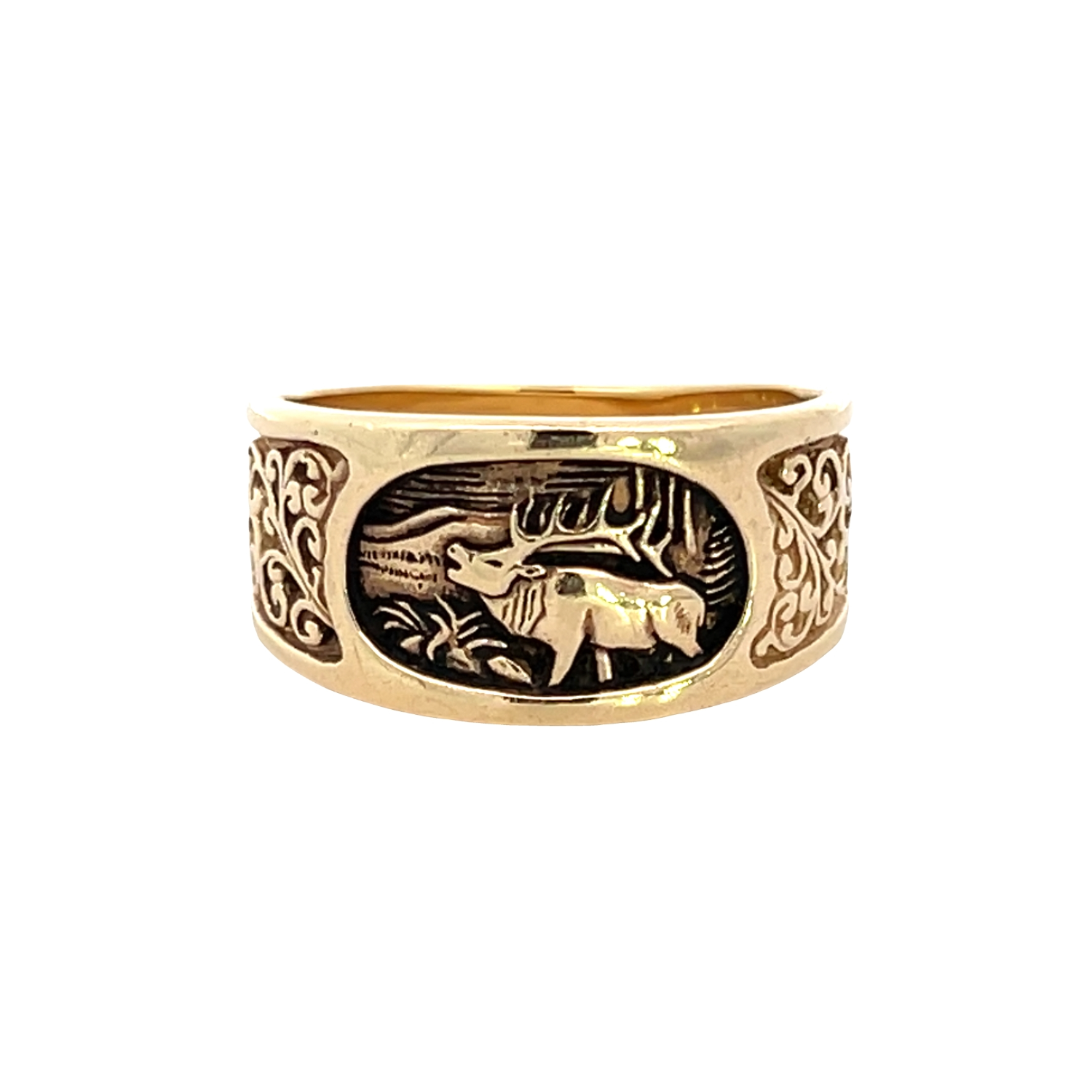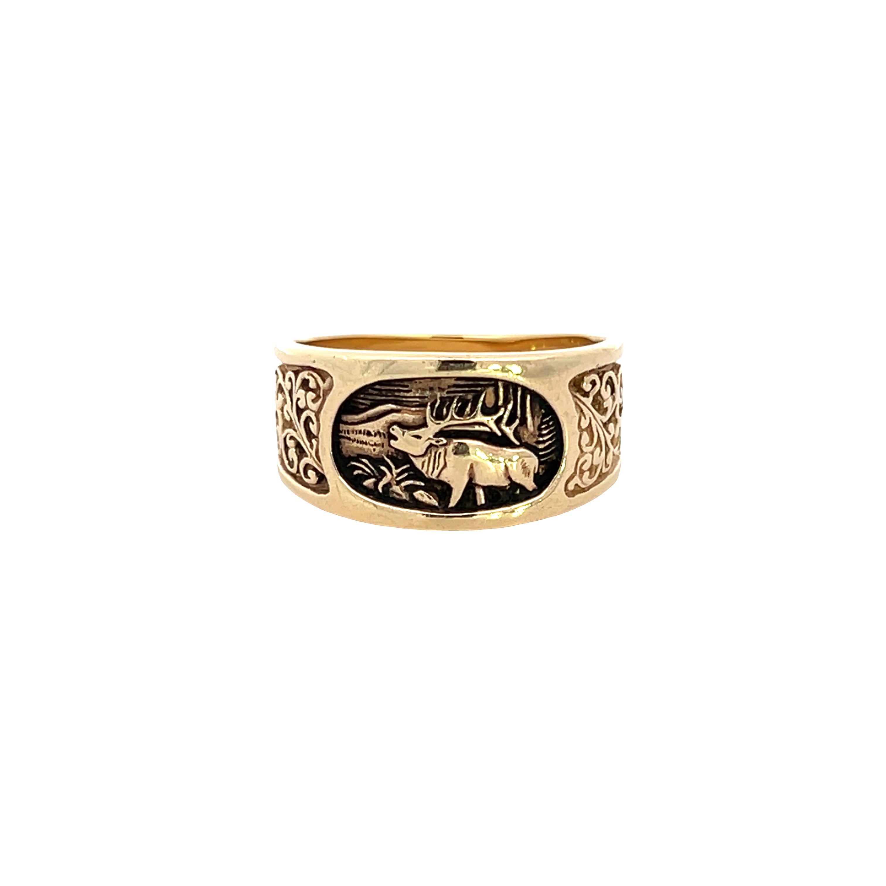 This estate 14K yellow gold ring features a detailed elk motif as the centerpiece, surrounded by intricate scrollwork and decorative engraving on the sides. The substantial band showcases skilled craftsmanship with deep relief carving that brings the majestic elk to life in rich detail. This ring is a distinguished tribute to the wilderness that speaks to those who appreciate nature's grandeur and artisanal excellence.Details
